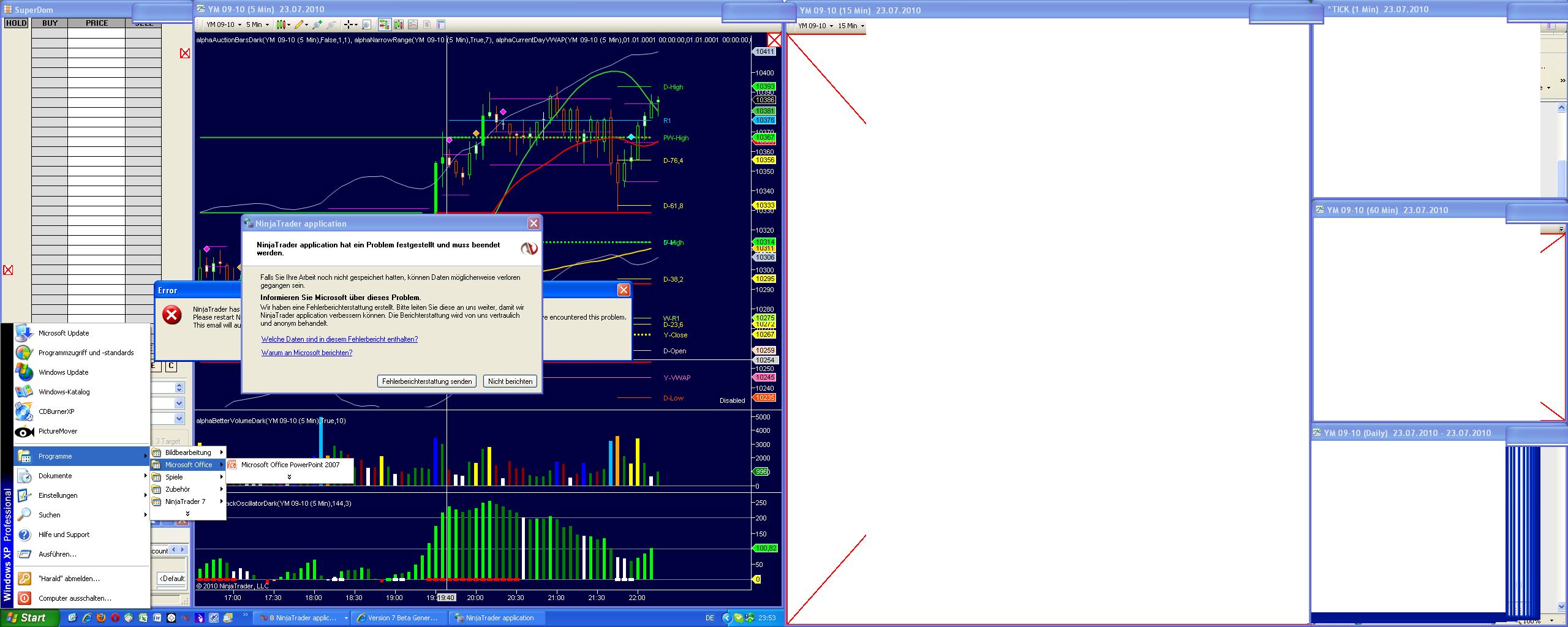 My standard workspace, not related to indicators. If you have a close look, the first indicator creating problems was TEMA, a system indicator. The whole problem was related to upgrading from NT 7.0.0.18 to NT 7.0.0.19. Now made a fresh reinstall and copied indicators, workspaces, templates, database, etc. into the new folder NT7. Works without problems today.
