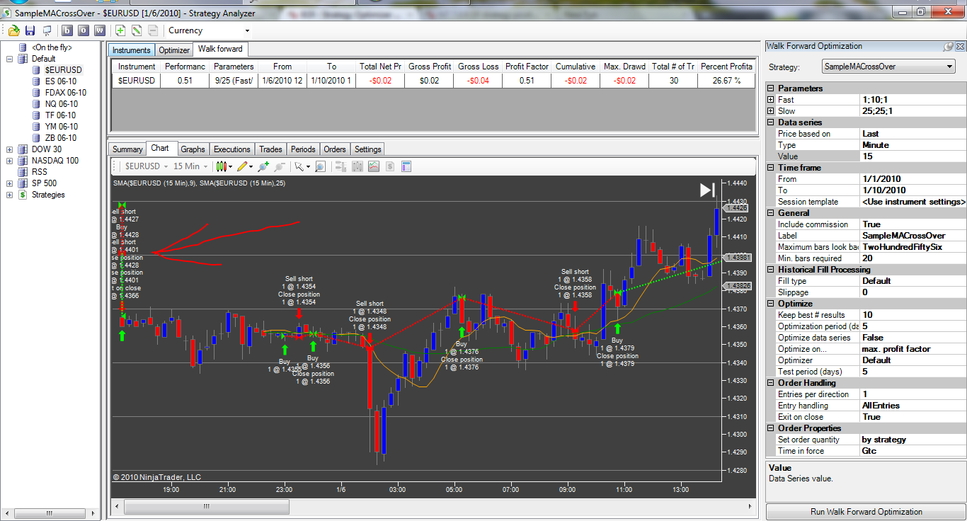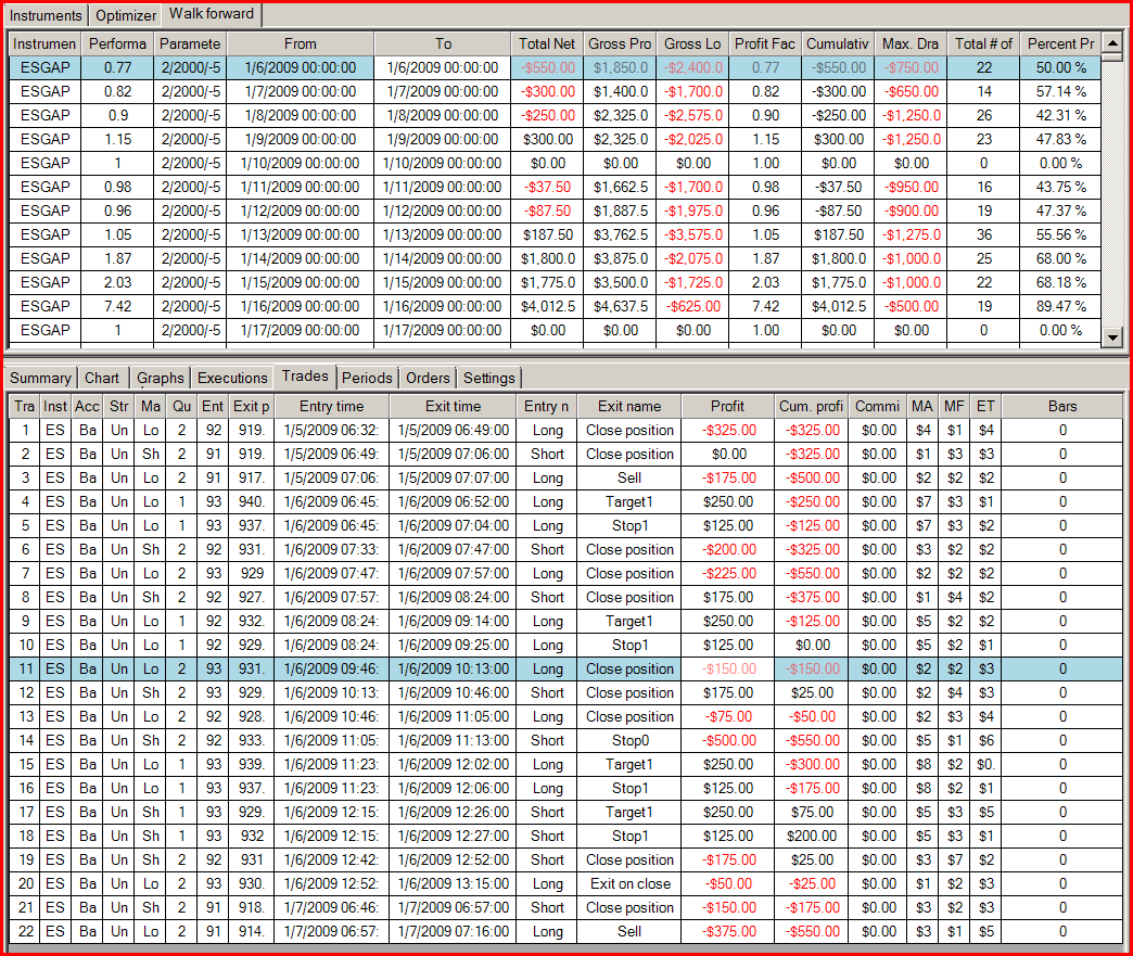 I have attached a screenshot that shows trades over 3 days (1/5/09, 1/6/09 and 1/7/09) which are all included in the walk forward summary for 1/6/09.