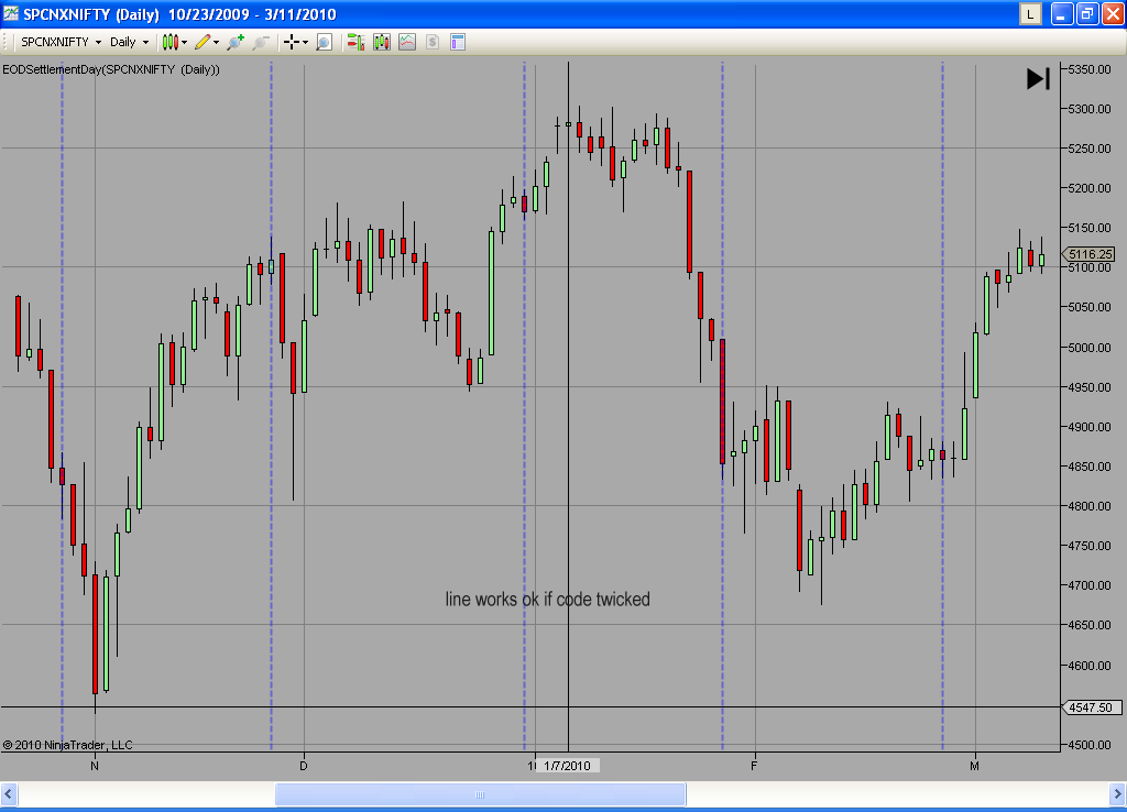 again i have made an indicator which is supposed to draw a vertical line on the last thursday of the month. it works fine except for if the last thrusday also happens to be last day of the month. however it works (atlest the line is visible) if i subtract one (see line 52 and 53 in the attached indicator). i am not getting the logic. may be has to do something with the earlier issue.