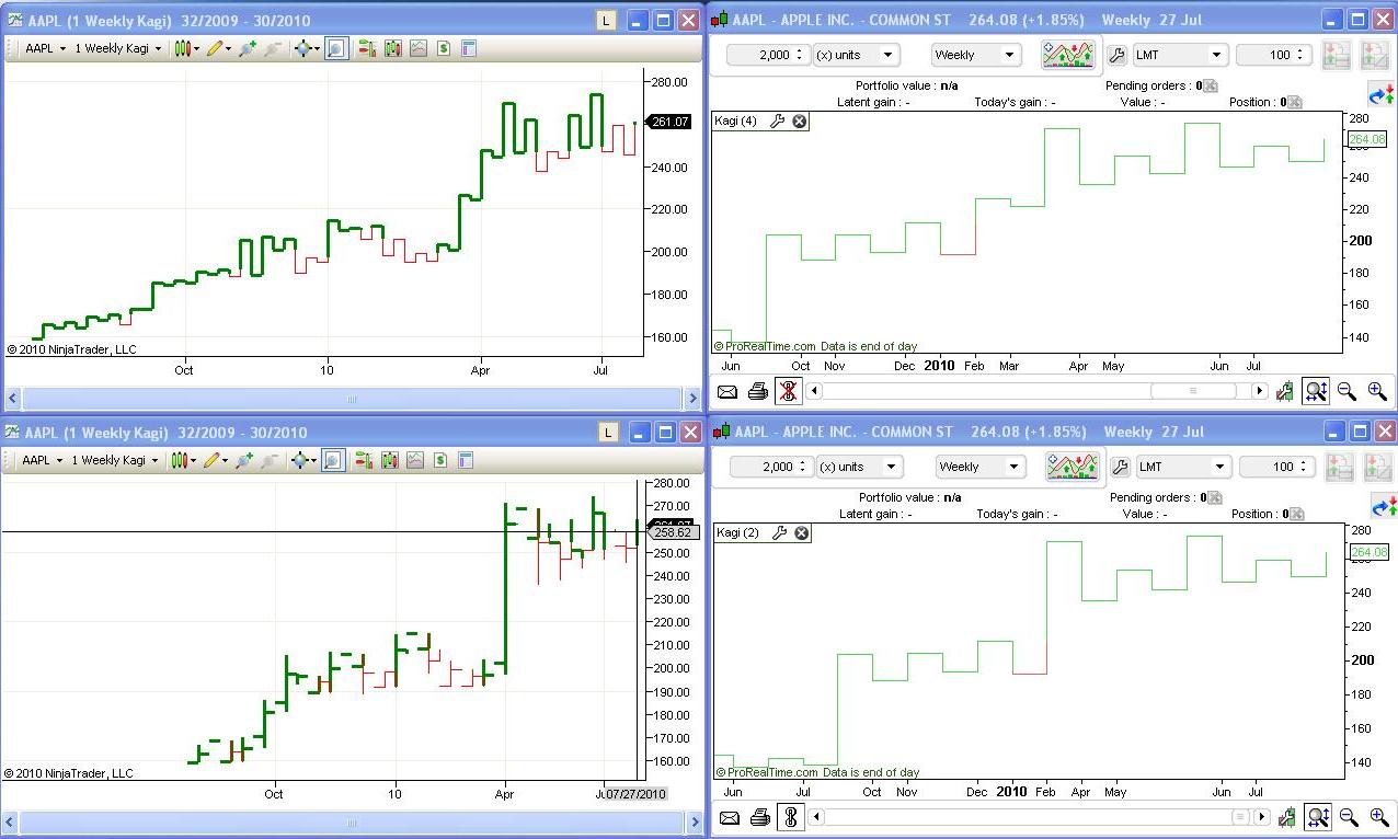 We therefore expect the Kagi Charts to be identical, for the tick reversal type, between NT7 and ProRT.