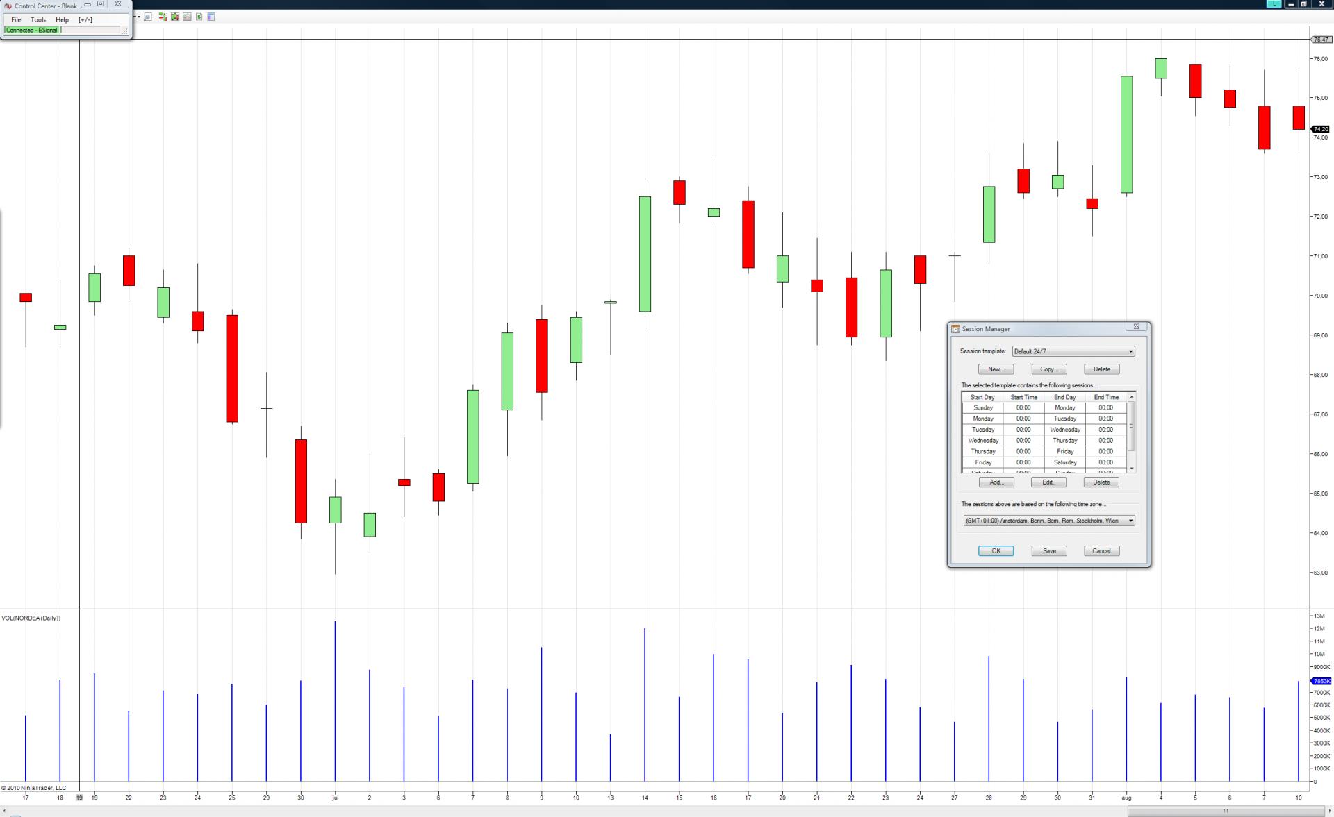 After restarting NT, today's bar on all my daily charts dissapeared. The minute charts work fine. The market analyzer (same settings) shows today's volume and Hi/Lo but Friday's range. I have doubble checked all the settings and use the same session template for minute and day charts.Last edited by mpe66; 08-09-2010, 10:30 AM.