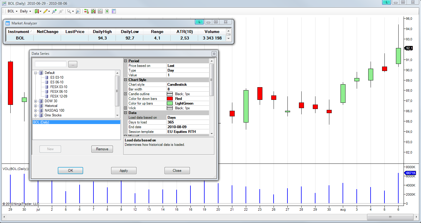 I did that yesterday and reloaded/ rebooted several times to no avail. Today however, everything is working again. Hopefully it will stay that way too.Originally posted by NinjaTrader_ChristopherJ View PostCan you please confirm you have the Range column Data series parameters set to Day. Next please right mouse click within your Market Analyzer window and reload all historical data..