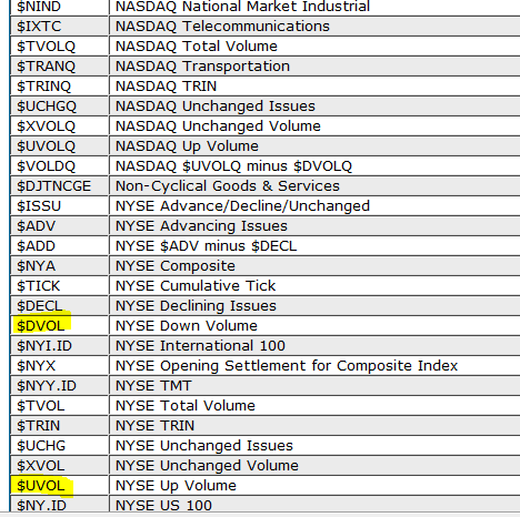 Hi Austin, no I'm not looking for the up/down vol., as I understand it $VOLD is up minus down vol. printed as a single index. When I added it in the symbol map at eSignal as $VOLD I started getting data except only printing as a single candle. I know others that use it as $VOLD from eSignal. I've attached a pic of what I get.
