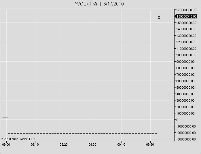After reading this thread http://www.ninjatrader.com/support/forum/showthread.php?t=5009 I changed the tick size from 0.01 to 10 for ^Vol ($VOLD) and now seem to get a correct plot.