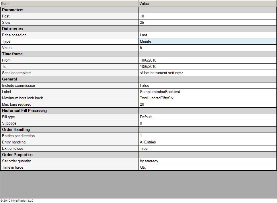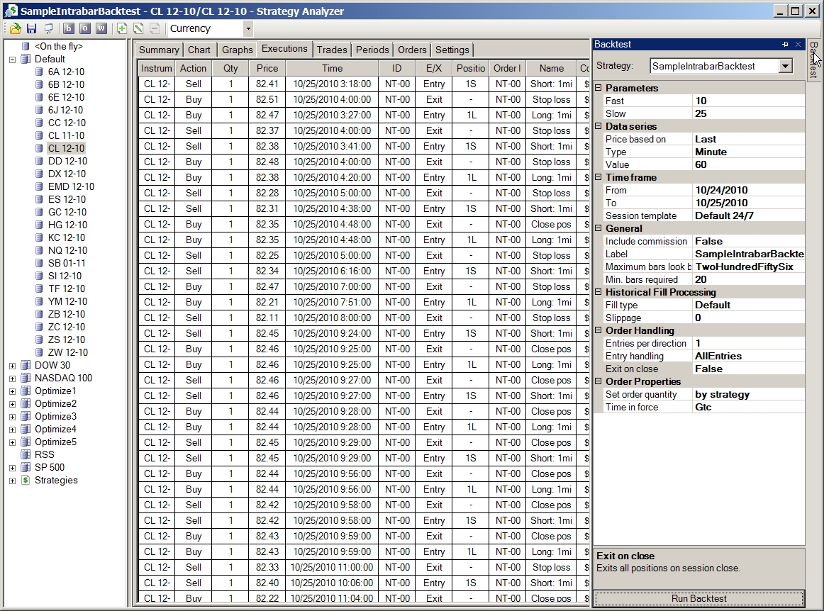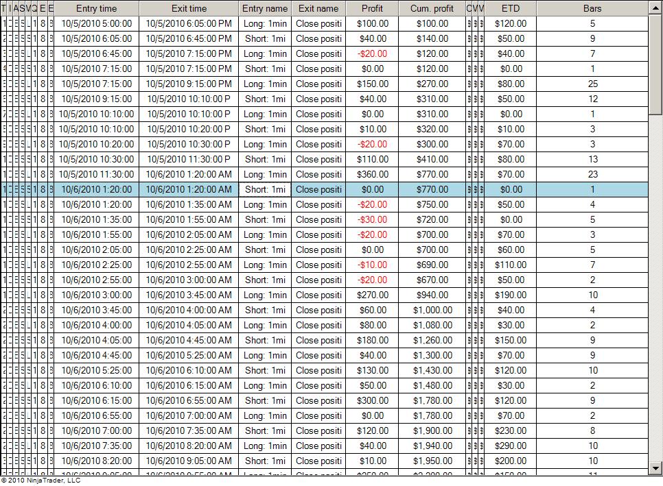 The test output I've included was generated using 5 minute bars as the primary series, and 1 minute bars as the secondary series on CL 11-10.