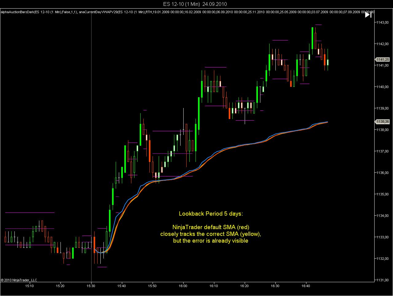 The left chart below is a 1 min chart with a lookback period of 65 days. The right chart is the identical, but has a reduced lookback period of 5 days. You will easily notice that the larger lookback period introduces an error to the SMA, which makes it unusable.