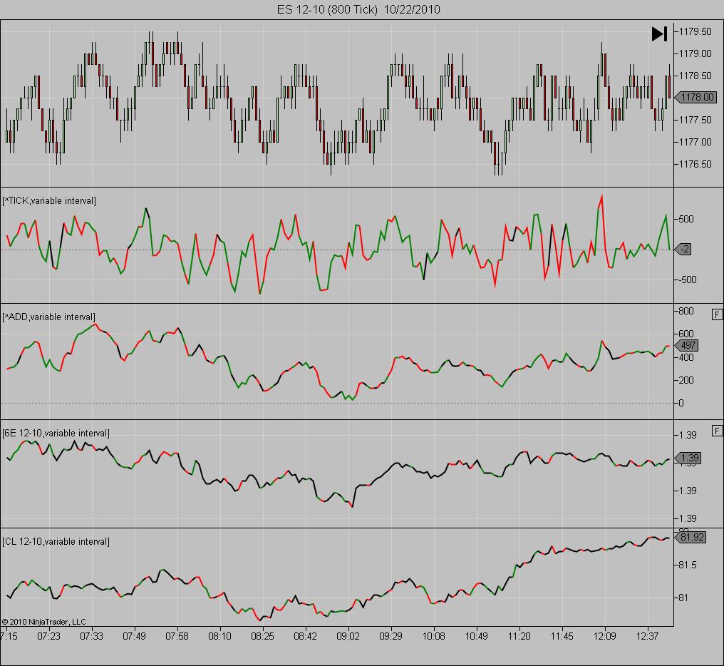 The attached screen shot shows a chart of the ES with four instances of the secondary line plot indicator, for TICK, ADD, 6E, and YM.