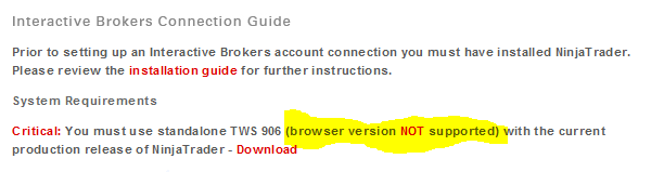 LTWCI, you will have to use the standalone version. From the IB connection guide, the browser version is not supported.AustinNinjaTrader Customer Service