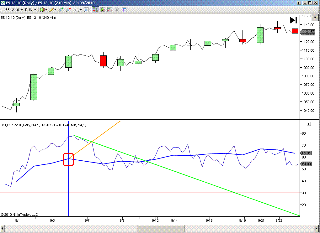 - Try drawing a trendline on the 240 min RSI starting off on a bar which coincides with the daily RSI (i.e. on the last 240 min bar of a trading session)
