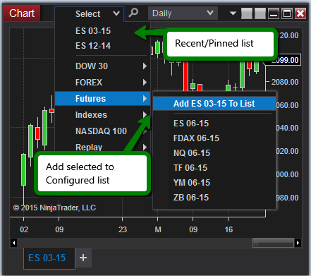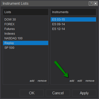 • Selecting "Add" on an instrument list will allow you type in the exact instrument and contract (ES 03-15) (selecting the search icon would only auto add the active contract month)