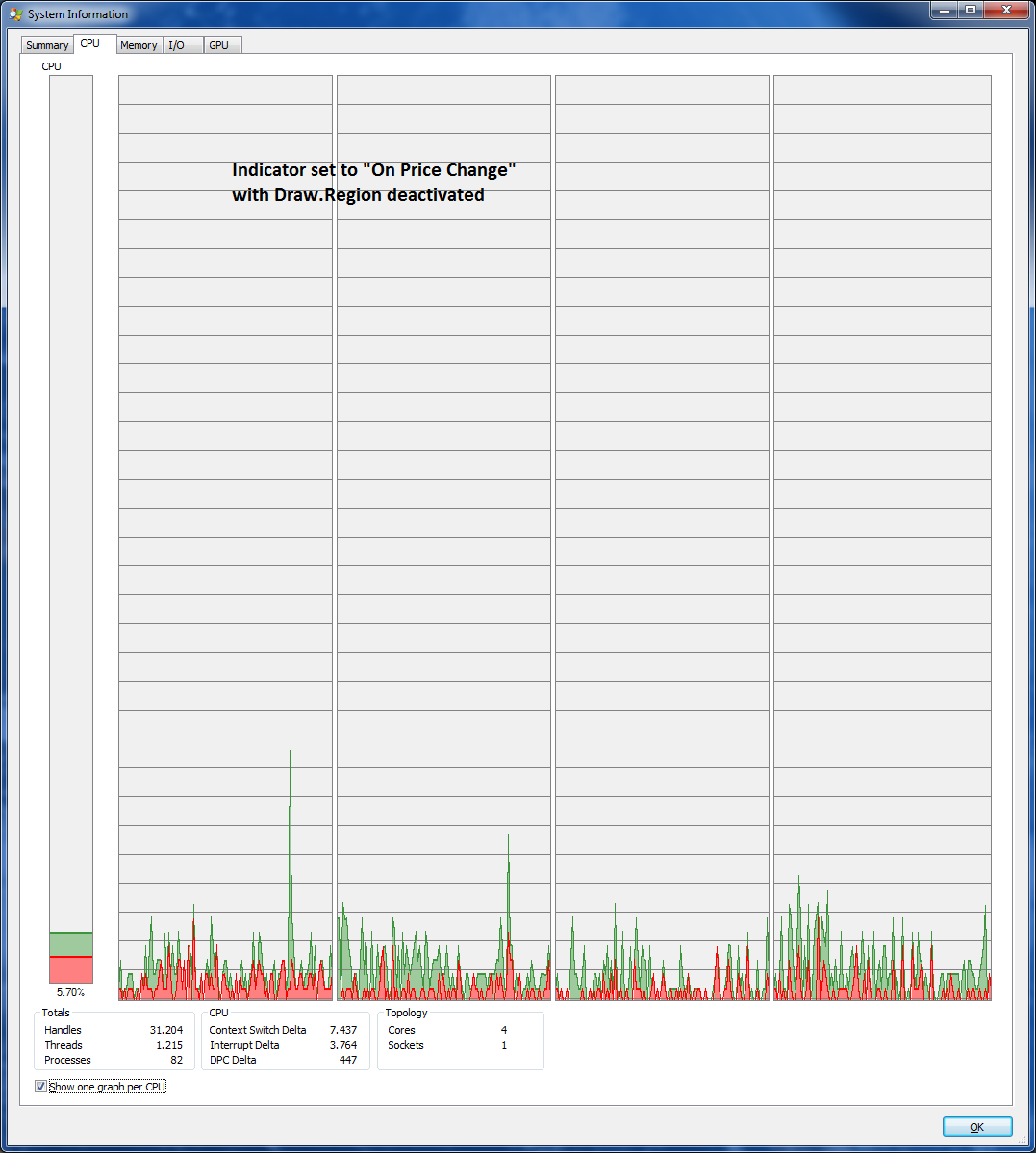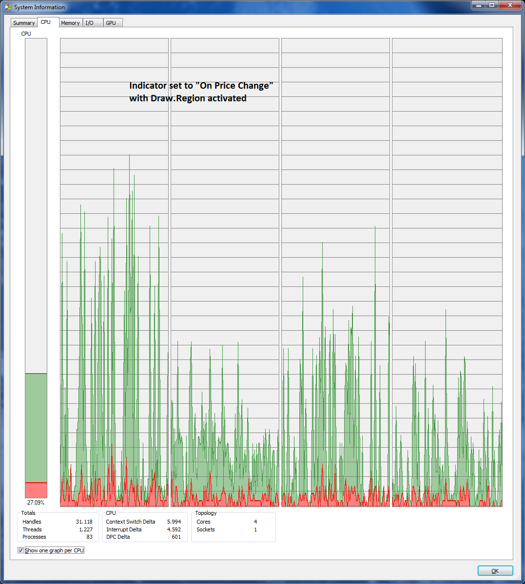 The first chart shows CPU load with Draw.Region active. The second chart shows the same indicator with Draw.Region deactivated (option available in the indicator). As you can see a single chart with Draw.Region applied makes NinjaTrader next to unusable. At the current stage this is much worse than the behavior of NinjaTrader 7.