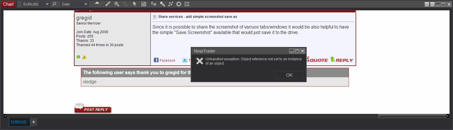 That's correct - as in the screenshot the "inside" of the chart didn't load after the update (you could see the application behind) with the unhandled exception raised.Originally posted by NinjaTrader_Matthew View PostTo be clear, you had NinjaTrader 8 open with those basic charts while updating your graphics drivers, and results in that exception?