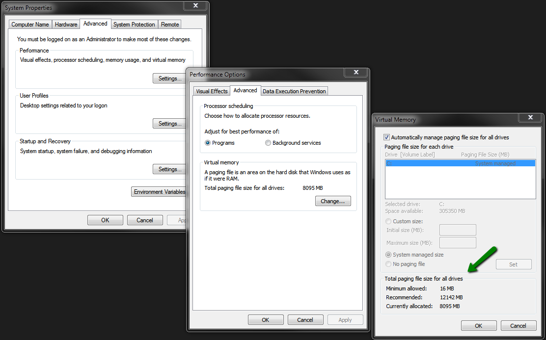 Can you look into your virtual memory allocation settings? This should be available from your Computers systems Advanced System Settings