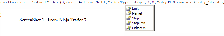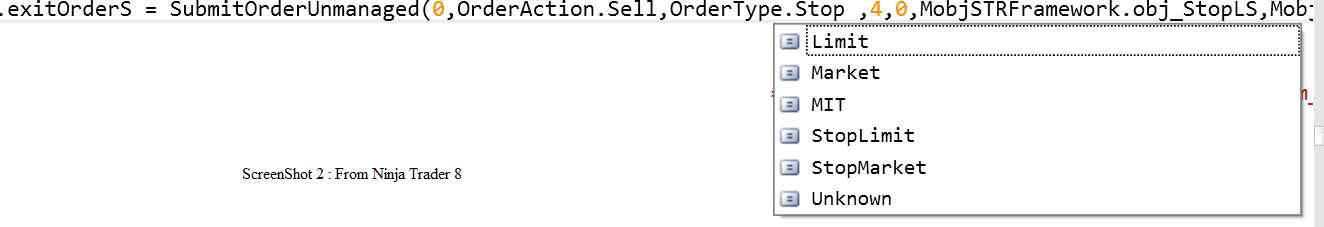 ScreenShot 2 is from Ninja Trader 8. Here OrderType does not contain a definition for Stop.