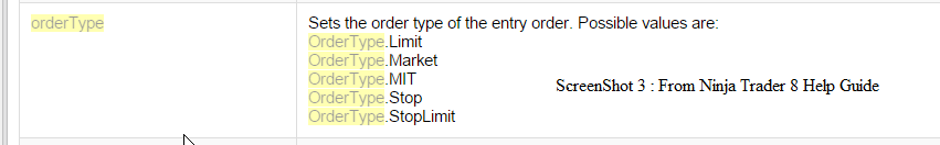 ScreenShot 3 is from Ninja Trader 8 Help Guide. Here OrderType does have a definition for Stop.
