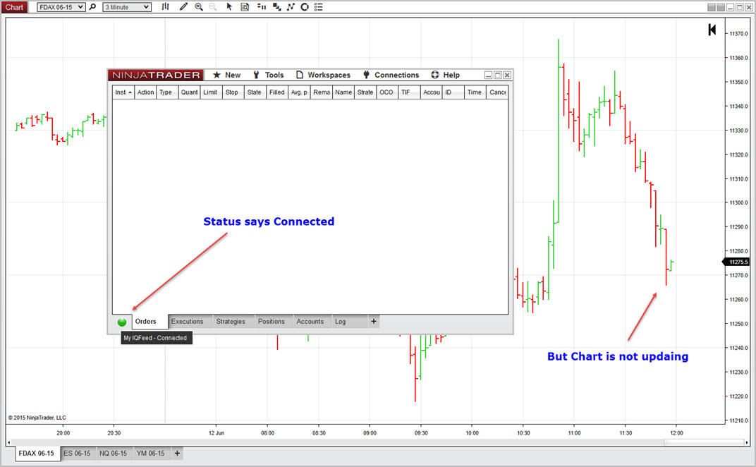 I am still having problems with the IQFeed connection. This morning my Dax chart stopped updating in real-time, but the Green Connection status said that the Nina 8 was still Connected. Please see attached. So this did not make sence.