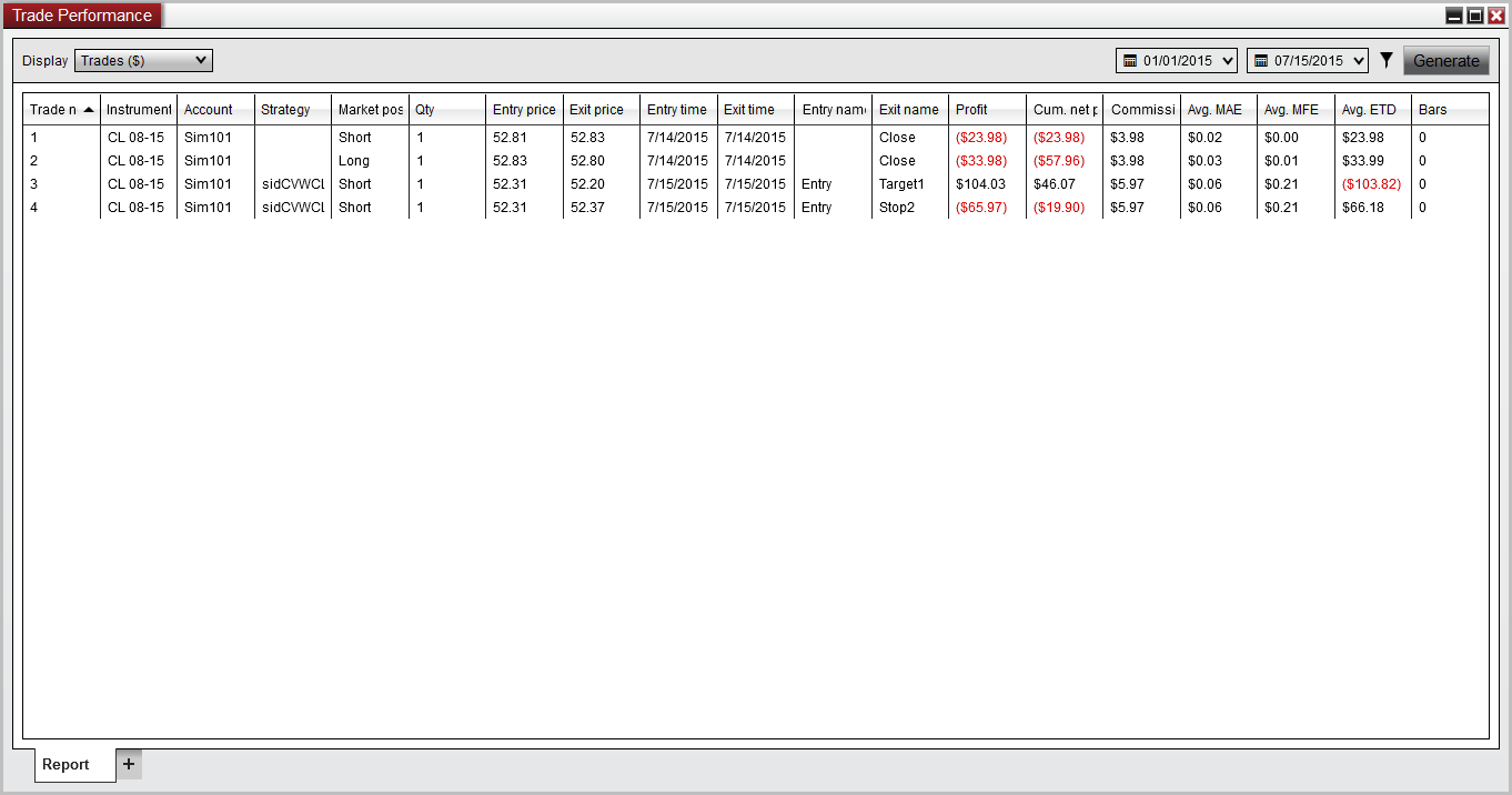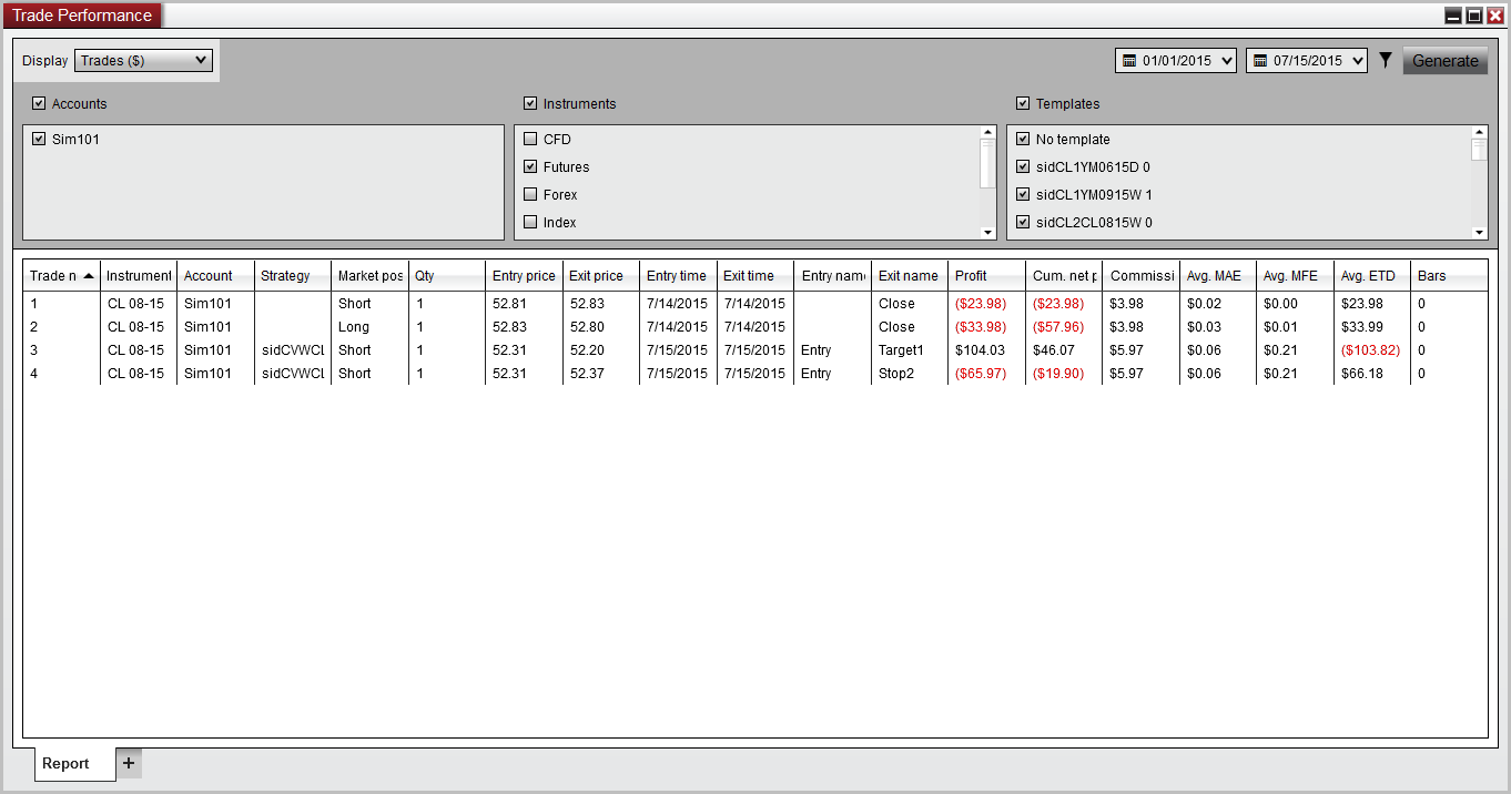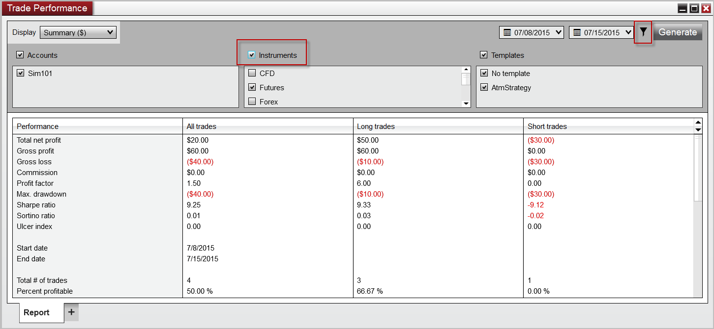 Although thinking about this.. As I mentioned, yesterday all 3 did seem to show correctly, but the orders were placed manually on the dom... Todays Sell order was actually placed thru a click of a button from an indicator that generated an OIF sell limit order on the chart.. That OIF order was attached to an existing atm strategy and once it was filled, automatically placed the atm targets and stops on the chart as expected.. When the first target of the atm got filled, I manually move original stop, which subsequently got filled as well... Not sure if that would make a difference or not.. I'll try to do some more testing, but something is off for me for sure..Originally posted by NinjaTrader_ChristopherJ View PostWithin the Trade Performance window can you please open the Filter and put a check in the Instruments box as referenced in the attached screen shot. Next please Generate a new report and let me know if the PnL matches what is shown within the Chart Trader panel and Accounts tab.