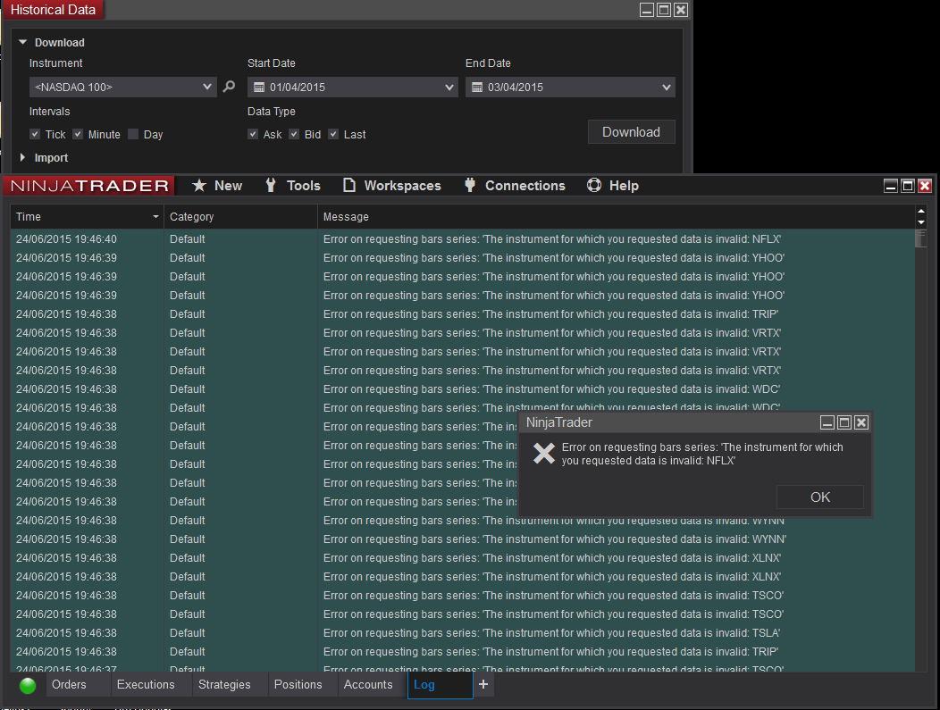 Strangely I couldn't reproduce the error last night but when trying today I'm receiving constant messages stating the symbol is invalid (screenshot attached). This creates many warning message so I had to kill the process and start NinjaTrader again. I could still load charts fine for the symbols it stated was invalid (e.g. NFLX).