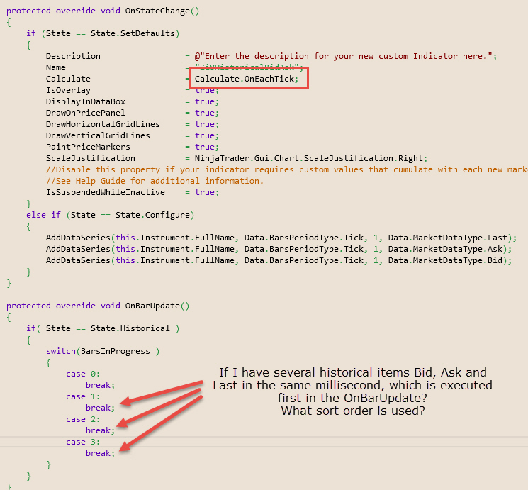 if I have several historical items Bid, Ask and Last in the same millisecond, which is executed first in the OnBarUpdate? What sort order is used?