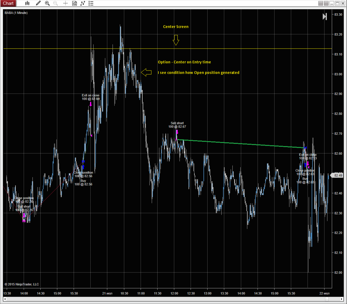 It may be nice to have the Option, Center on Entry time, Center on Exit time, or display full trade Entry to Exit time... I suggest you do for first time Center on Entry time, it is will approach for most traders.