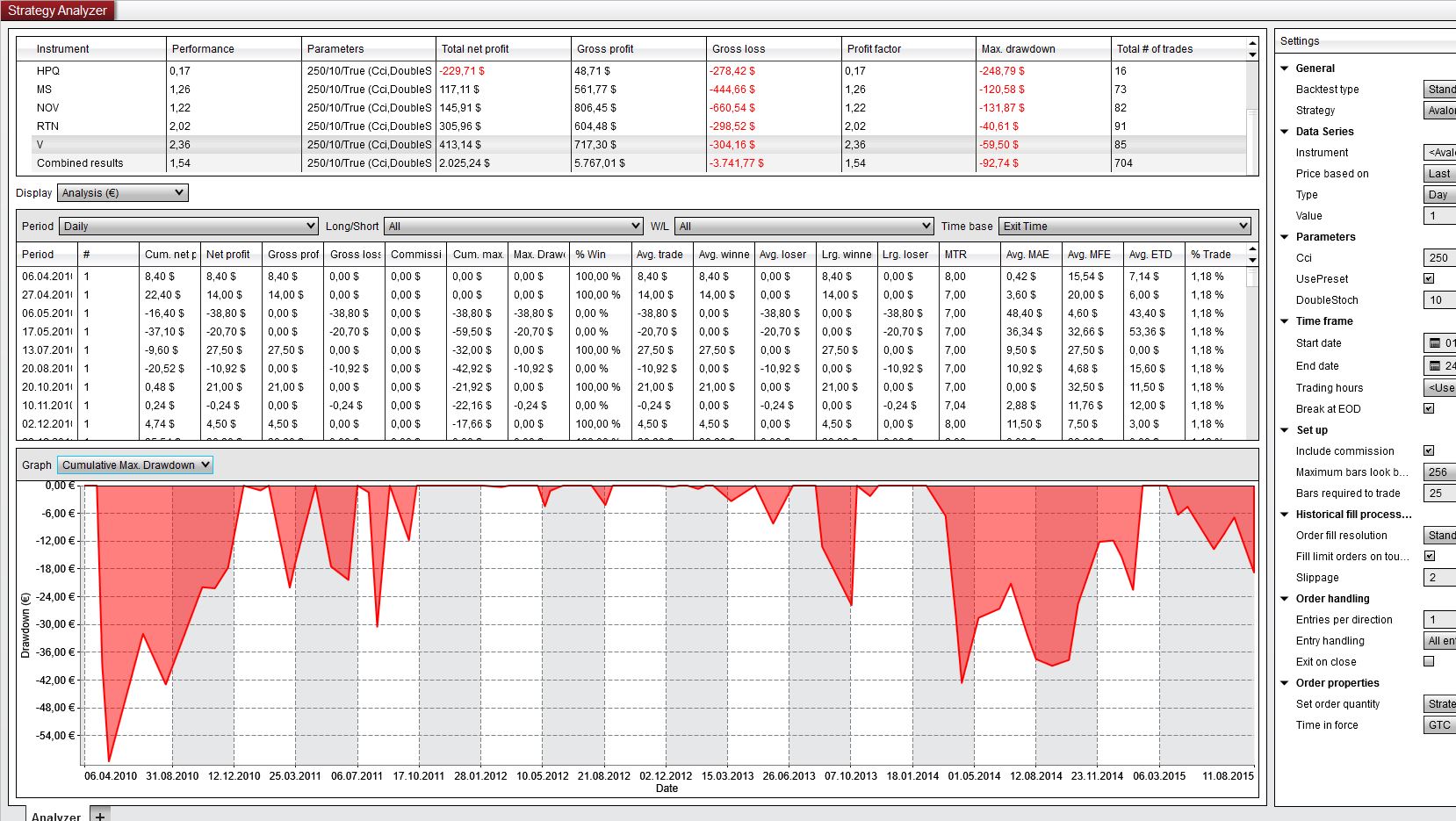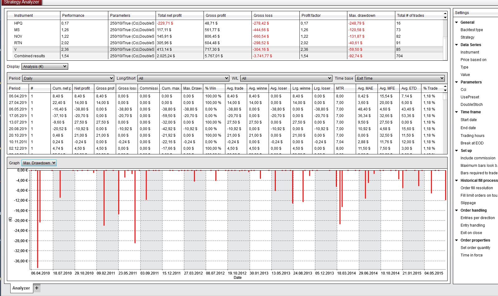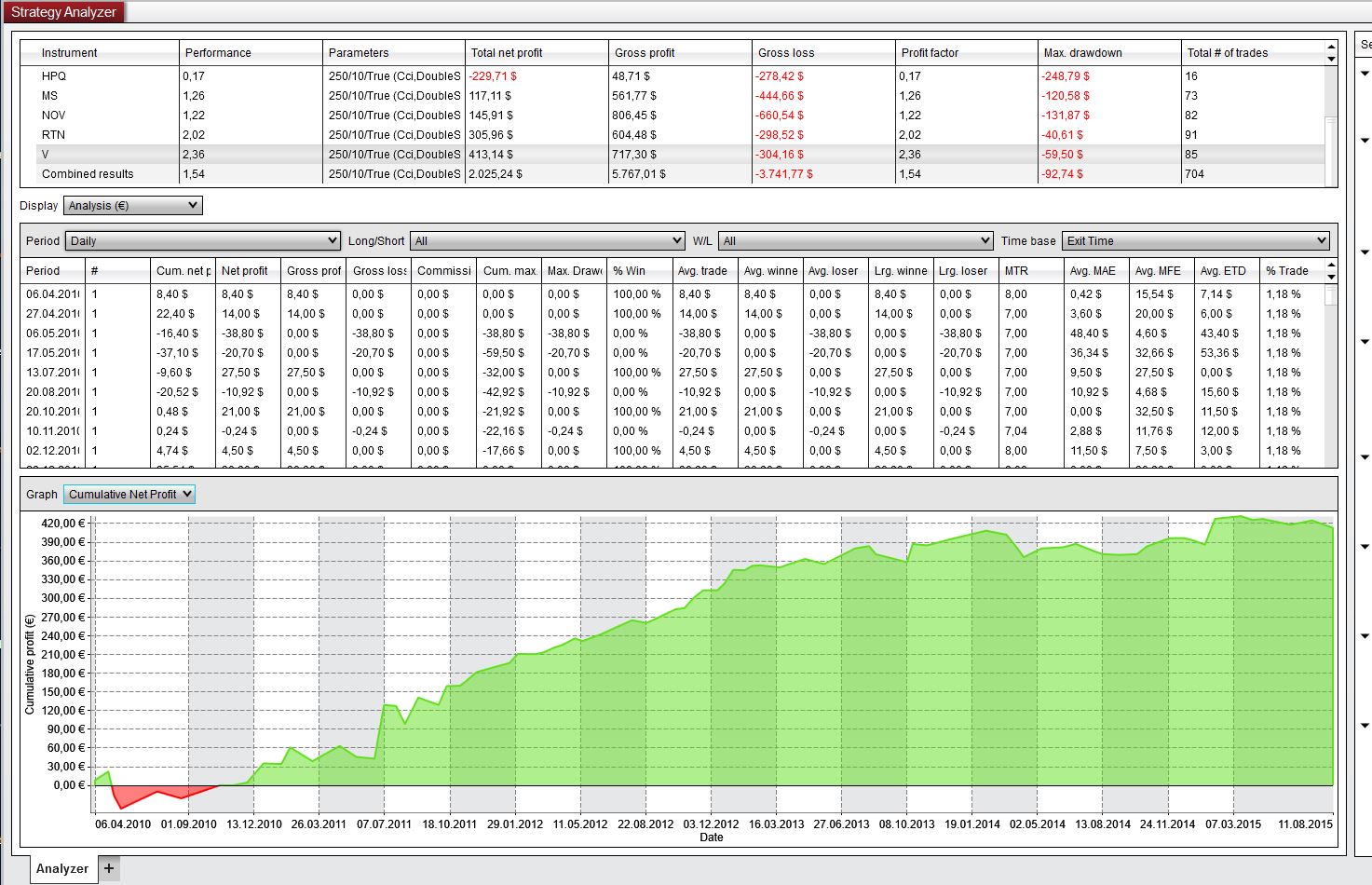 There seems still no Analysis Possibility in the Combined results. How can I archive some Graphical View of the Cumulative NetProfit/ Drawdown for a basket of stocks over a period of time? At least a Text View? Without NinjaScript?