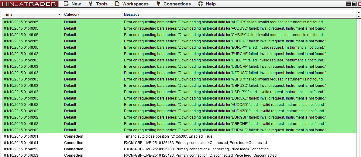 That's great Dave! Thanks. Any progress with reproducing my problems with FXCM servers? I just disconnected, disabled "use ninja historical servers", reconnected and immeditely got about 18 error dialogs for all the charts I have opened. (see attached)