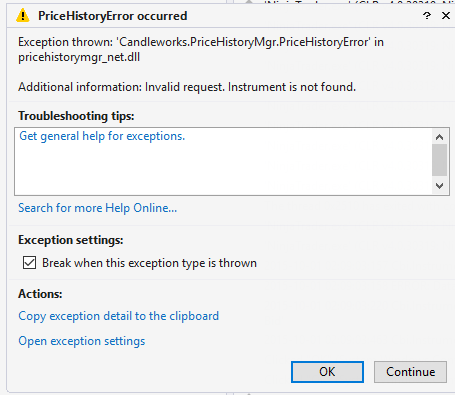 This instrument not found exception is proving hard to reproduce by your platform support team. But Ian getting the error quite consistently in historical requests for forex pairs when using FXCMs servers. The exception is being thrown in a 3rd party library called fxcodebase which is either utilised by ninjatrader directly, or indirectly via FXCM's API layer (probably the latter) I don't have debug symbols for the library so I can't drill into the exception to see what's being requested and why it's failing so if you have any debug symbols for this third party library please send them and I will investigate.