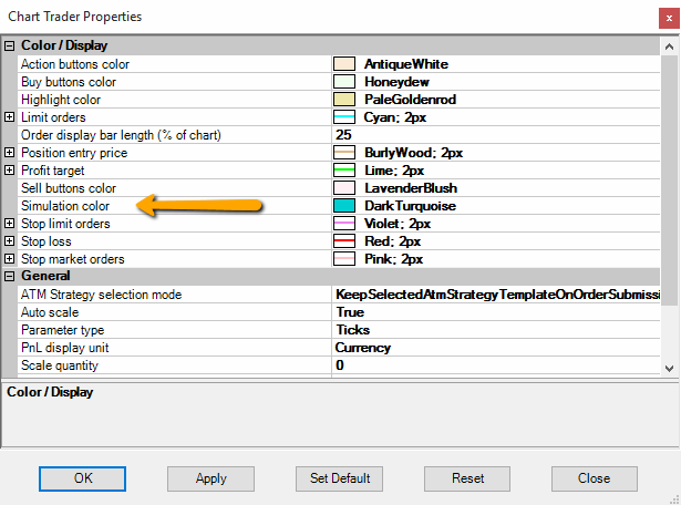 Please see Control Center > Tools > Options > Trading > Simulation ColorOriginally posted by koganam View PostWe use that to quickly differentiate between our Sim trader and the real money account, when we are trading them simultaneously for any reason.