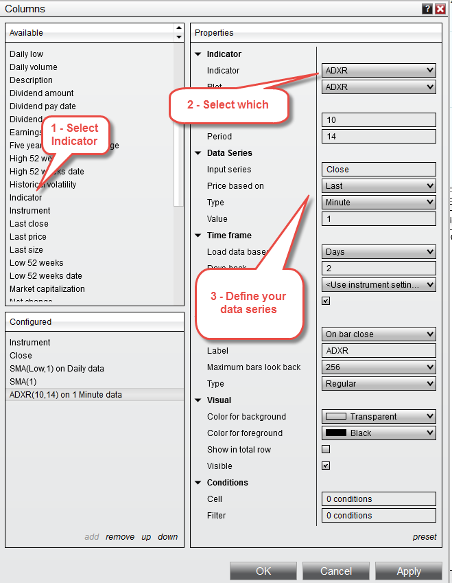 Also, are we able to add multiple data series to a column. I.e. if a 5 minute SMA and 15 SMA and 30min SMA are all doing something, the column would display a green background.