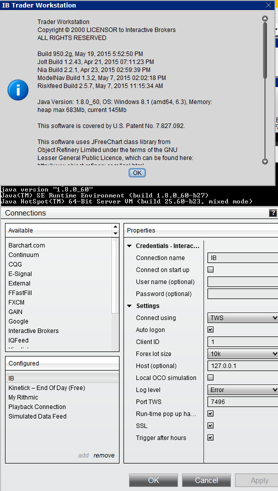 2/ Tried to connect with NT8B05 custom to IB with and without Rithmic and NT 7 up and shutdown.