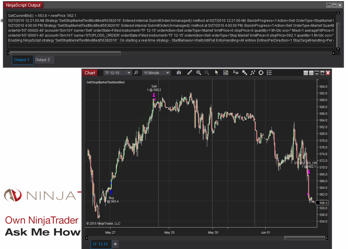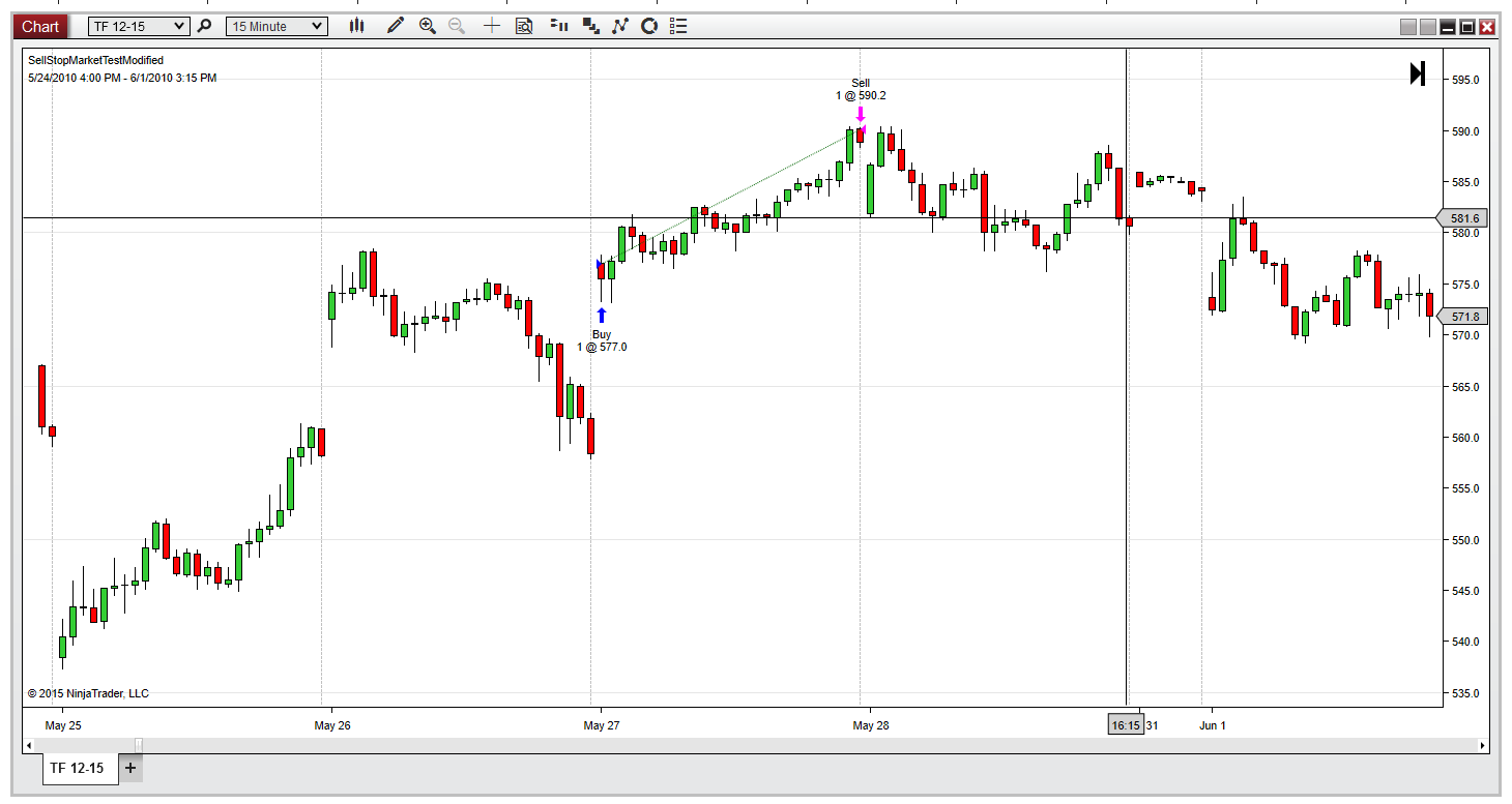 5/26/2010 4:15:00 PM Strategy 'SellStopMarketTestModified/56392768': Entered internal SubmitOrderUnmanaged() method at 5/26/2010 4:15:00 PM: BarsInProgress=1 Action=Buy OrderType=StopMarket Quantity=1 LimitPrice=0 StopPrice=565.4 SignalName=''