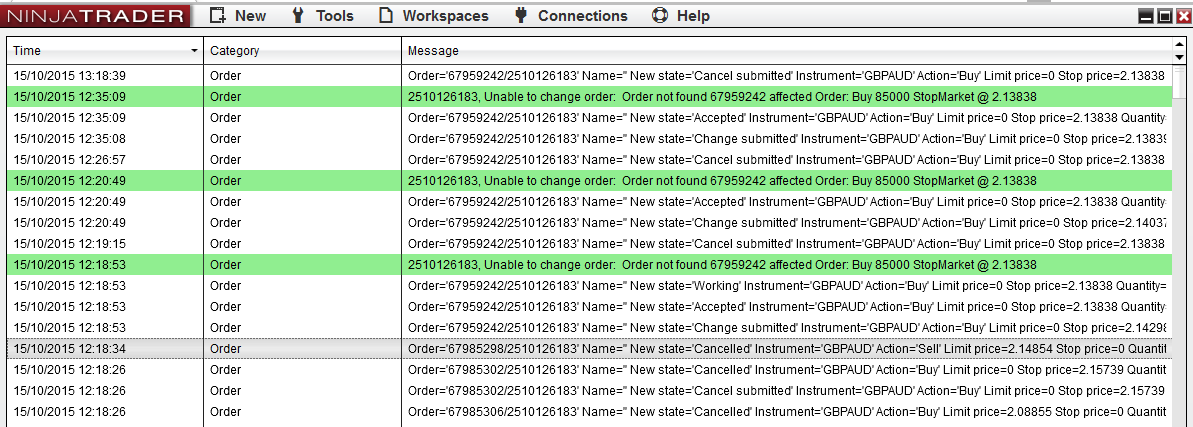 2. In rare circumstances when NT8 does miss an external update from FXCM and unbeknownst to Ninjatrader the order has been cancelled externally, an attempt to cancel said order; results in an order which is stuck in a "Cancel sumbitted" state.