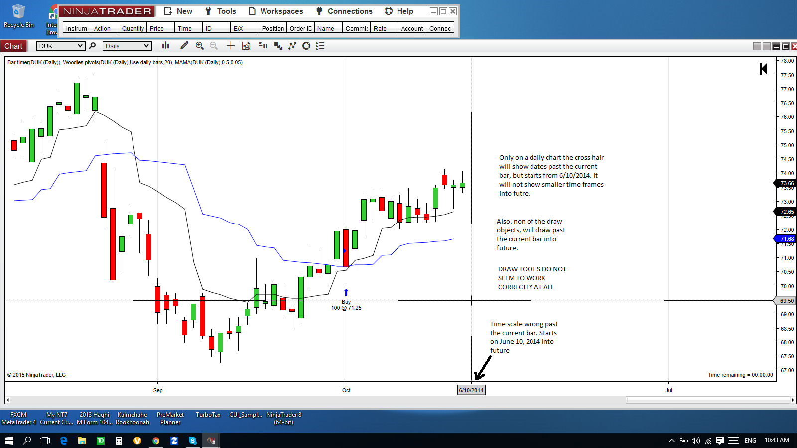 Not sure if its bugs or what, but cross hair projection into furture only works on daily chart and starting with wrong date (6/10/2015).