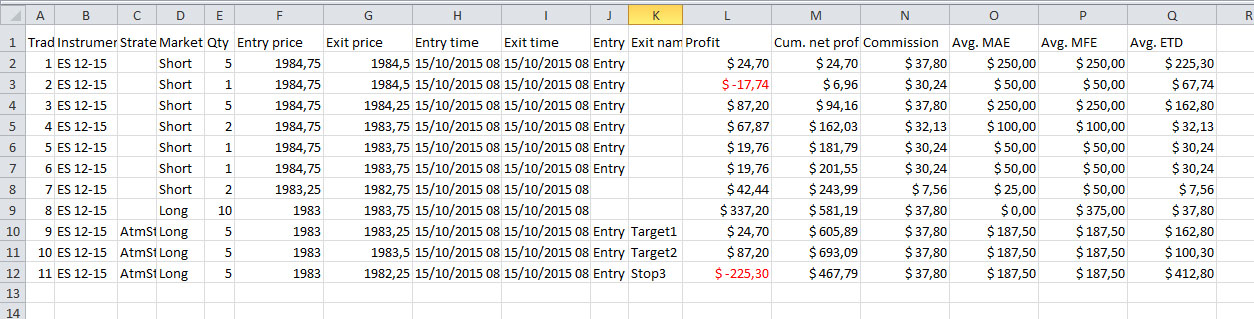 En la ella los 6 primeros trades entre con 15 contratos y se fueron cerrando parcialmente,