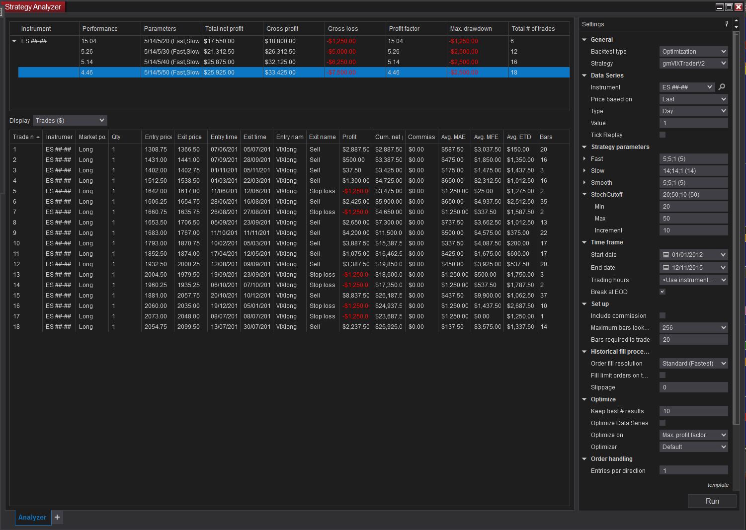 OK here are two captures, the first is the results of the initial optimization using max. profit, the second is the result after I change the optimizer to max. Sharpe ratio. Note in the second that the trades are in ^VIX instead of ES.