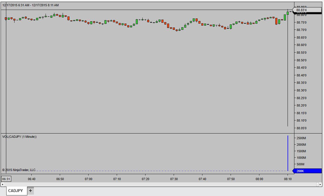 Thank you for reporting this to us. We have been investigating a similar issue with the FXCM adapter. Can you please add a VOL indicator to your chart, and tell me if you see a very large spike in volume on that bar? Also, does this occur when you switch back and forth between instruments, or does it occur in other cases, too?