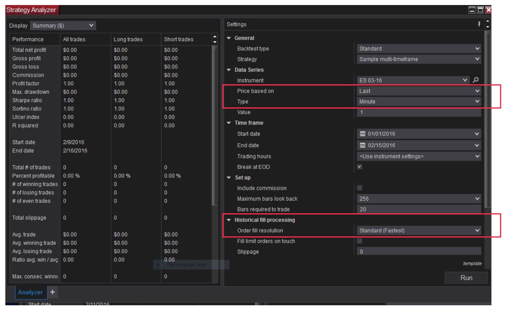 Thanks Paul. Once I have coded the strategy you mentioned in post 6 of this thread (quoted above), what would I select in the two areas circled in Red in attached 1.jpg when backtesting (or optimizing) it in the Strategy Analyzer?