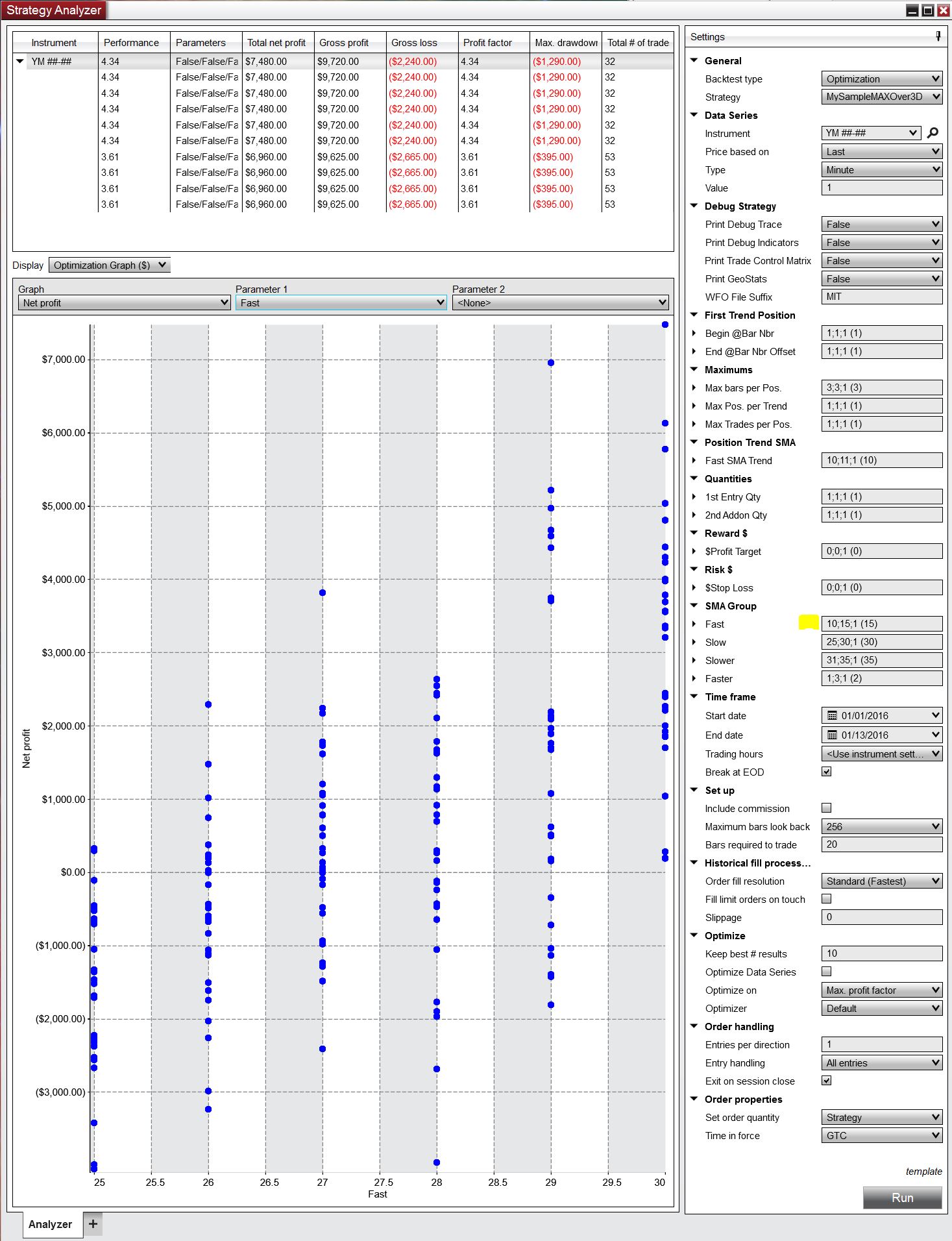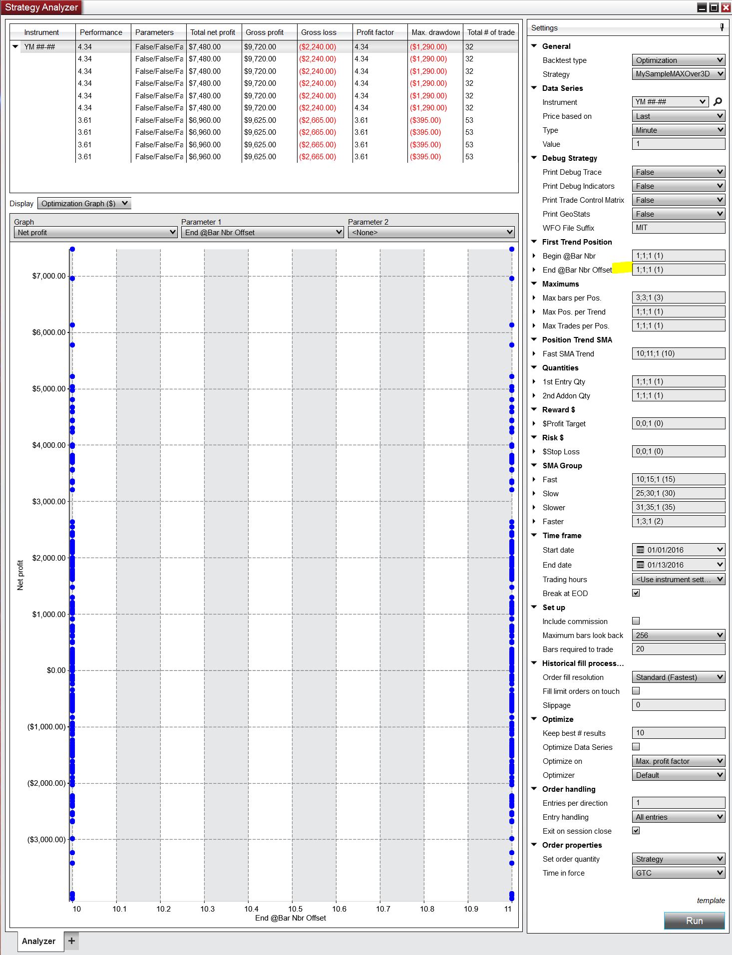 Looking at the NT optimization graph, you can see that the x-axis labeled "Fast SMA Trend" has it parameters ranging from 3 - 5 (should be 1 - 20) and z-axis labeled "End @Bar Nbr Offset" has its parameters ranging from 10 - 20 (should be 1 - 3).