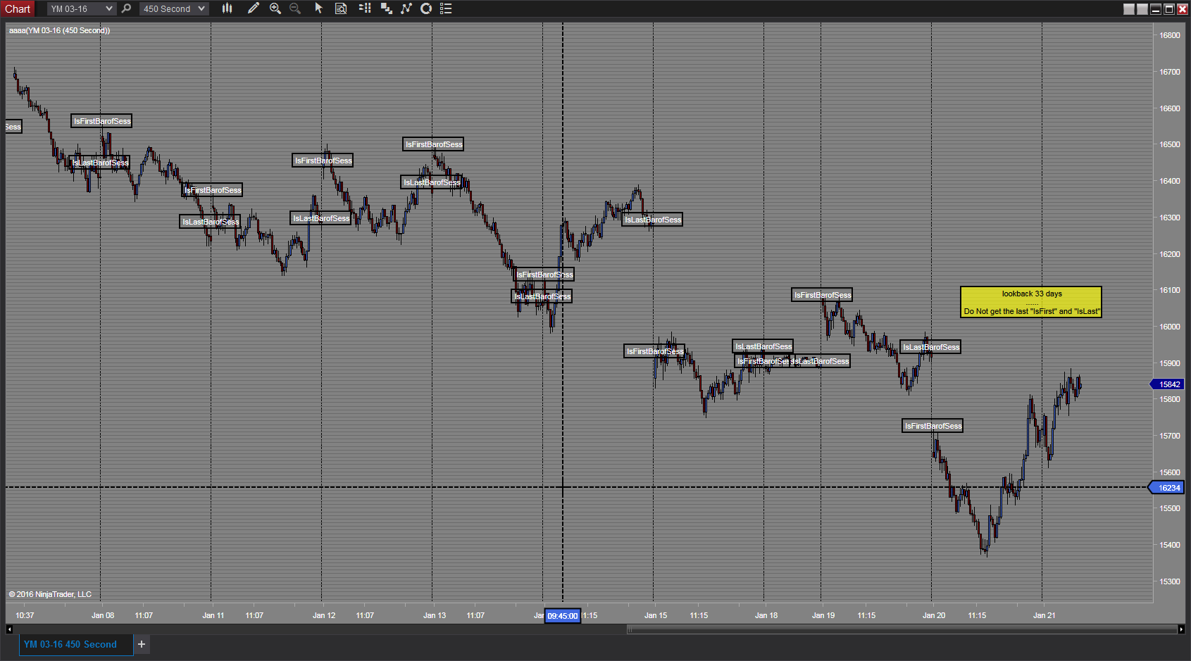 Once it starts, I can then run the charts and flip back and forth, and the missing IsFirstBarOfSession will consistently not work on the chart that is a different 'lookback' from the lookback period on the chart the data was initially loaded under.