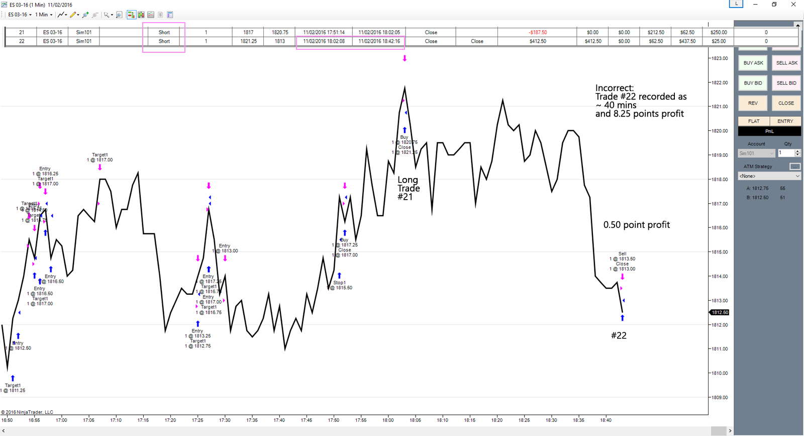 I am not using any strategies. I did use an ATM stragegy with 10 point stop and 20 point take profit. After setting the ATM strategy to none; i repeated the test, Enter 1 lot long, then close it out - and the trade is logged as a short as before.