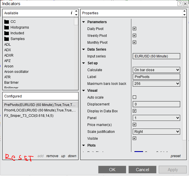 I think it would be a great idea to add an Indicator Reset button to the Indicator Selection dialog box from a chart. This button would be super helpful when testing custom indicators. Sometimes a refresh of a chart does not take all the changes made to the indicator source code and you have to remove the indicator and add it back again. If a reset button could theoretically remove and re-add the indicator automatically, I think it would save time when testing. Or when you just want to reset the indicator back to its original source code form.Tags: None