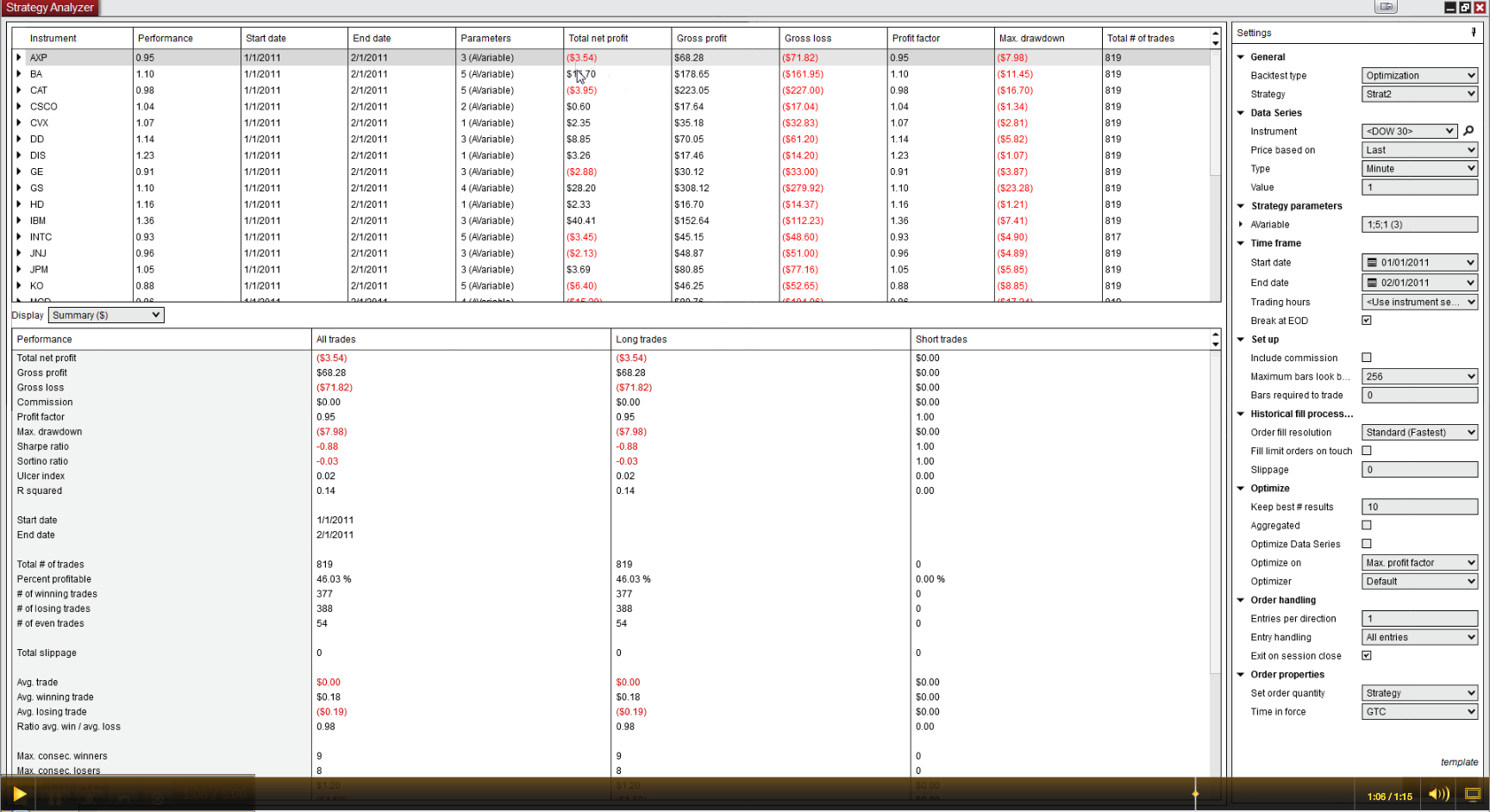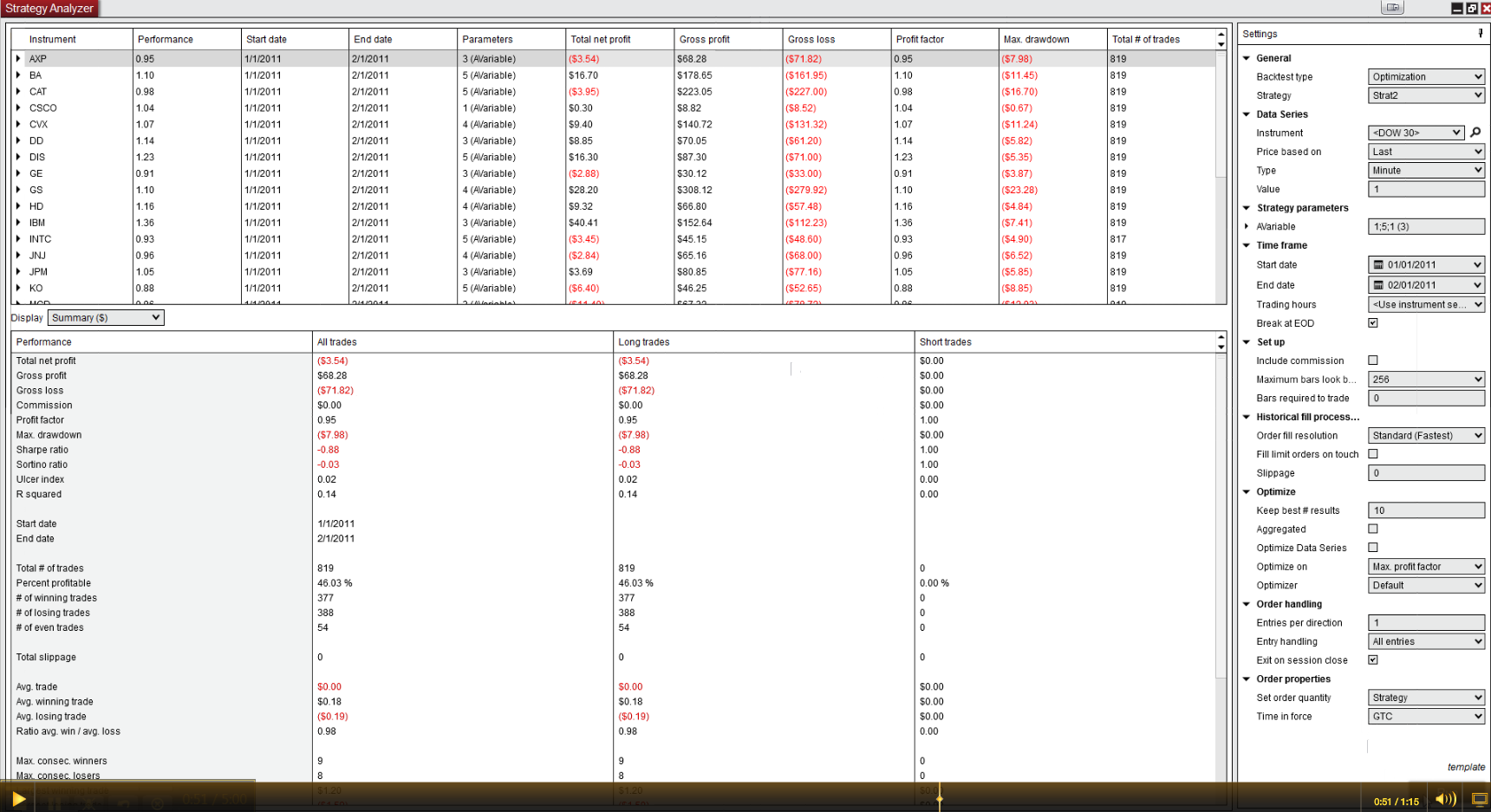 No, from the screencap and my previous post, the problem with single instrument optimizations (when a secondary series is present) is that the results are unstable. This means that the same optimization can provide different results when run over and over, even though there are no stochastic/random processes involved in the strategy.