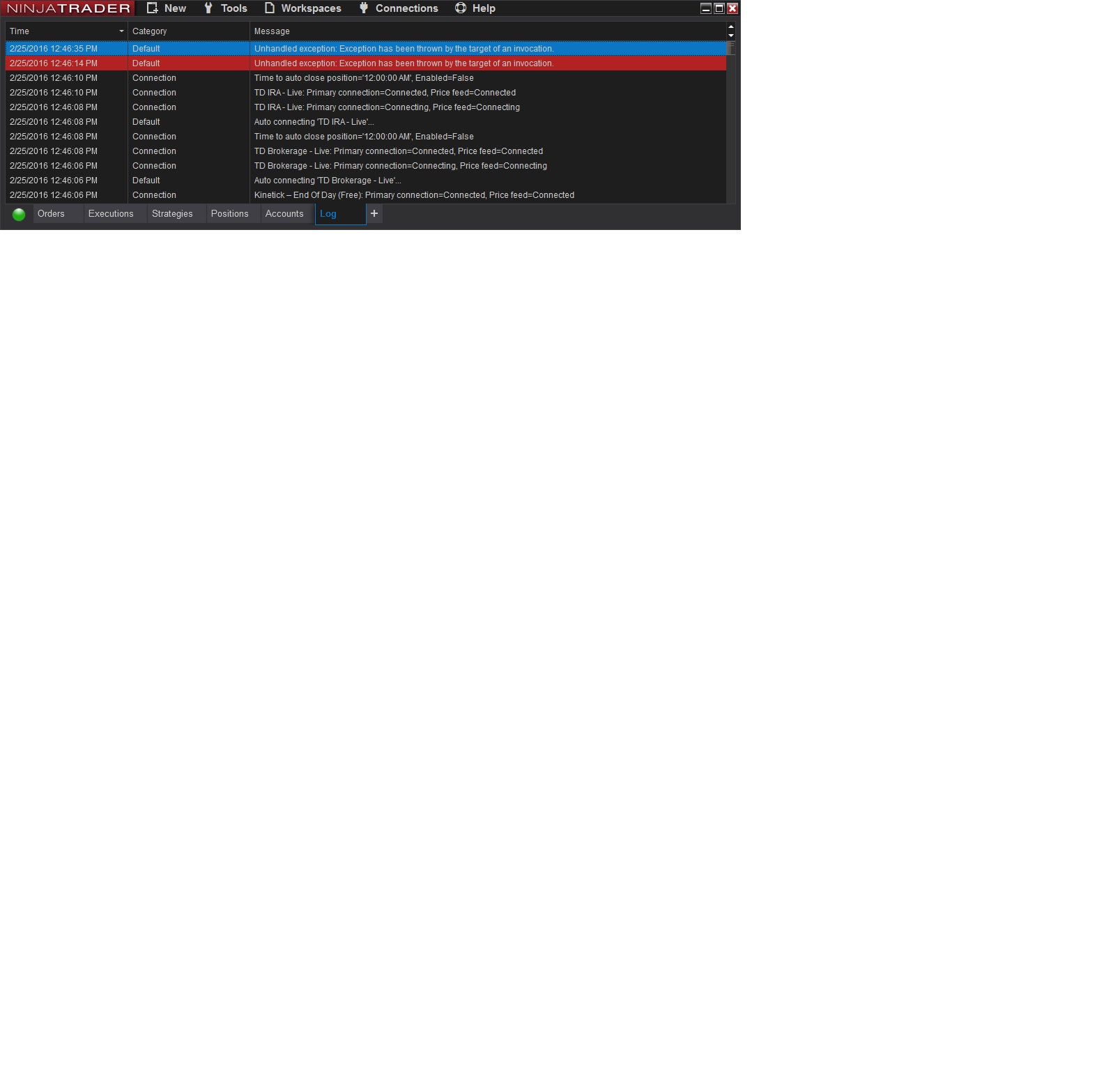 Please write in to platformsupport[at]ninjatrader[dot]com with your log and trace files and a link to this forum post..