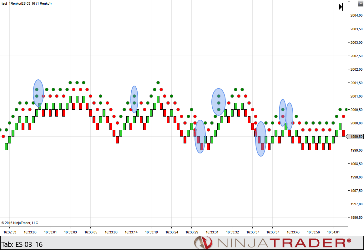 Try the test on 1 Renko and set 1 or 2 days to load. You'll certainly find such places yourself. But when you are trying to see a dot's properties to find the dot's bar index, be patient, the properties take some time to load because of huge quantity of the dots.