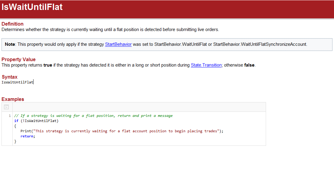 If the Start Behavior is not set to Wait Until Flat, then IsWaitUntilFlat will always be false. If the strategy is currently waiting until flat, the property will be True, and whenever it is not doing so, it will be False.