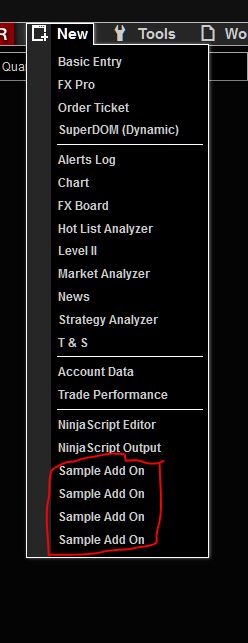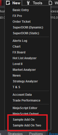 1) The 'New' Menu should contain AddOns named with the class name of the AddOn: e.g.: NinjaTrader.NinjaScript.AddOns.ZScoreWriter