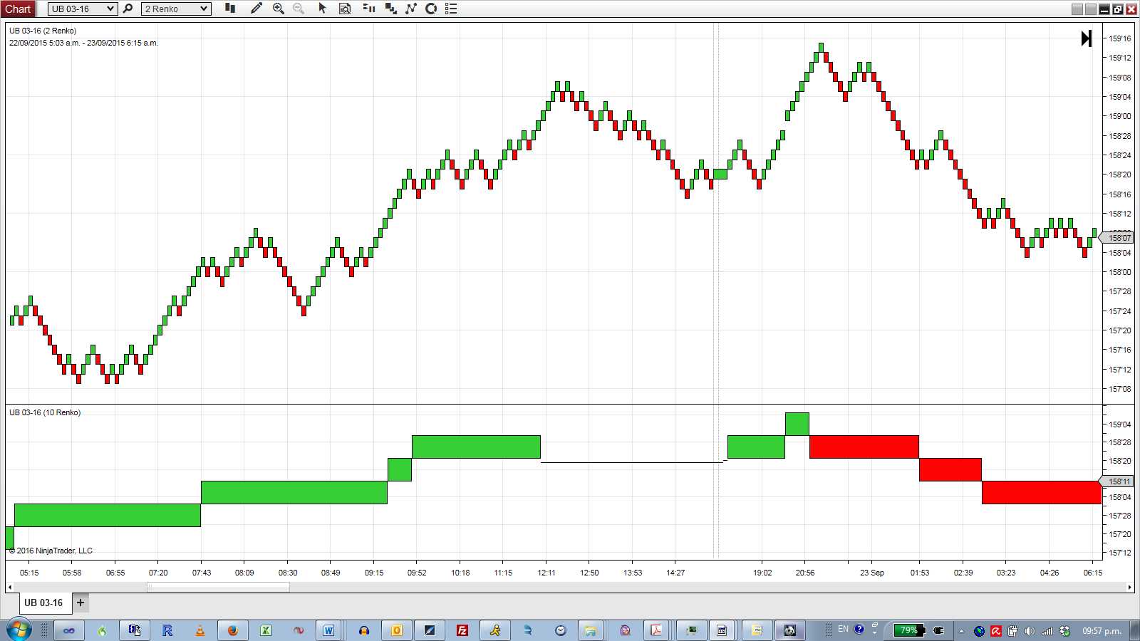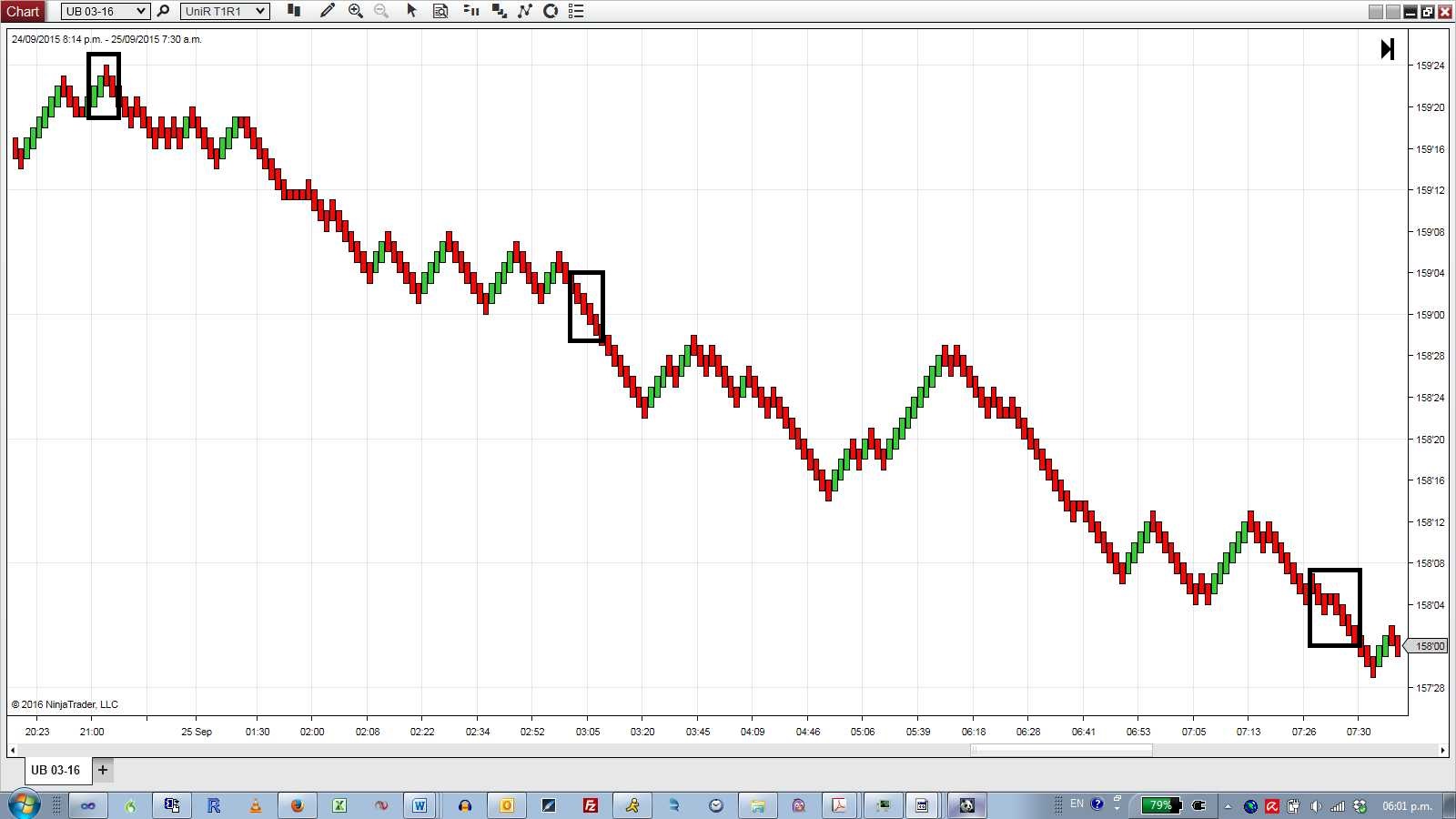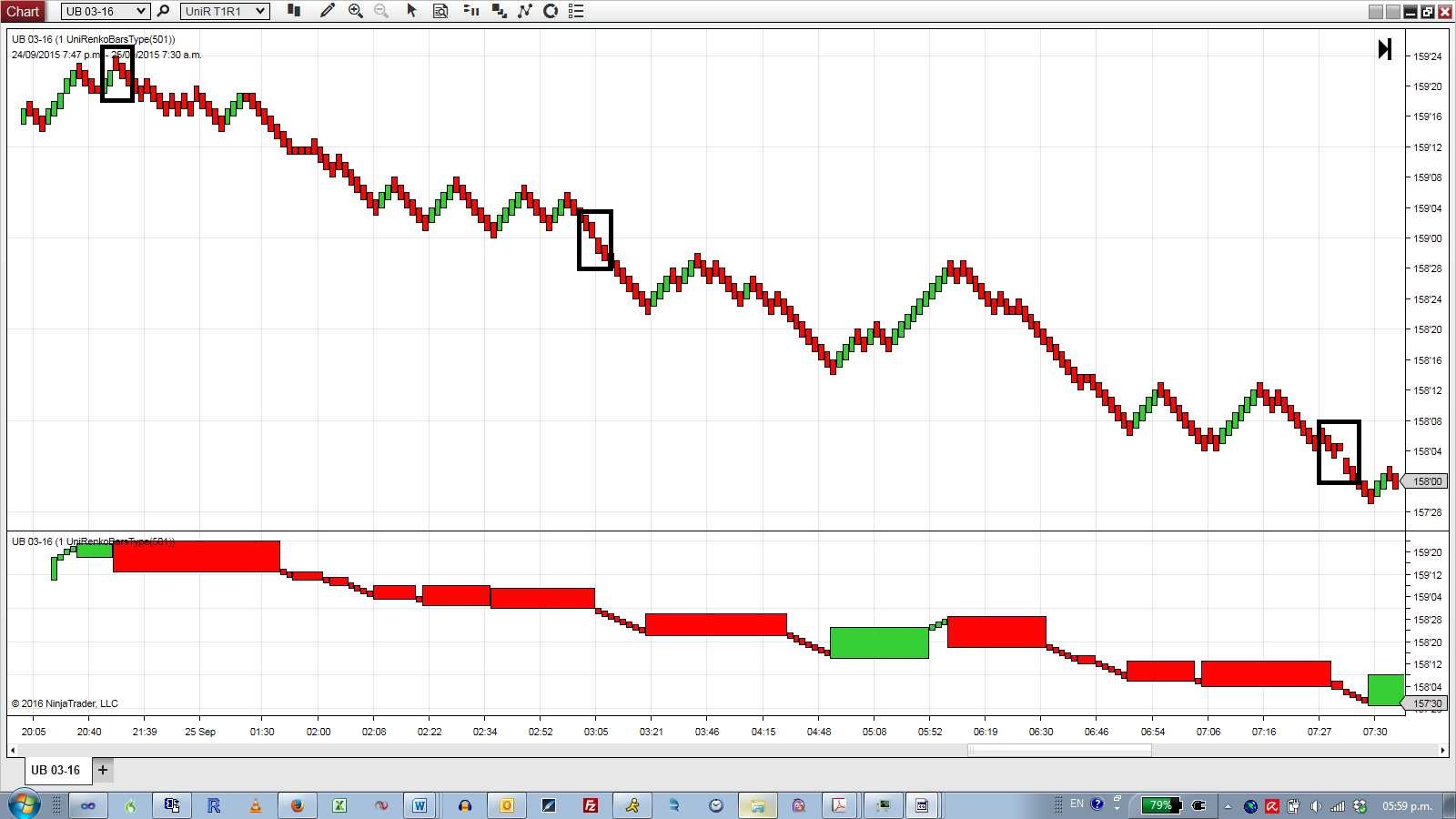I'm seeing the same issue with the Renko bars. See attached screenshots at around 20:56 pm on 22 Sep 15. On the bottom panel in screen4, there's also one or two bars that appear as lines instead of boxes which I haven't seen with UniRenko so far.