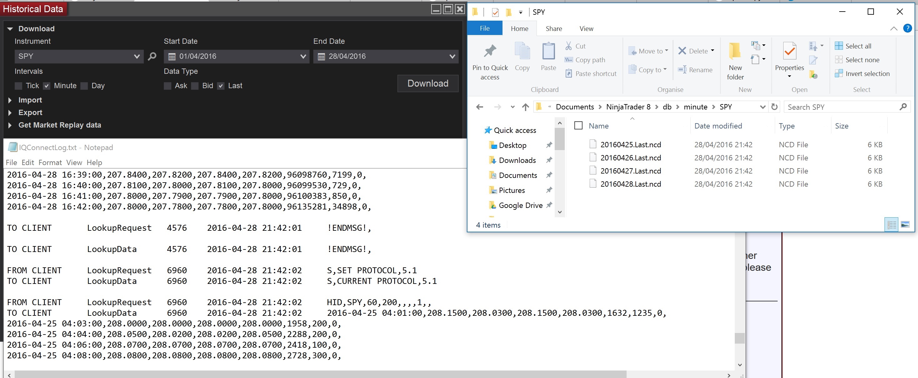 Hi, re-attached is the screenshot. It shows the download settings, the log file from IQFeed (where I've configured it to log the downloaded data and can see the end of one request and the start of the next and also the Ninjatrader minute folder for SPY.