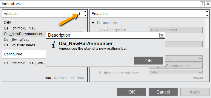 It is there. Click on the italicised "i" for the Indicator description; parameters are implemented as ToolTips.Originally posted by DaveE View PostIn NT7 the Indicators window for Charts had a panel that displayed the Description property according to user selection (indicator or specific parameter).