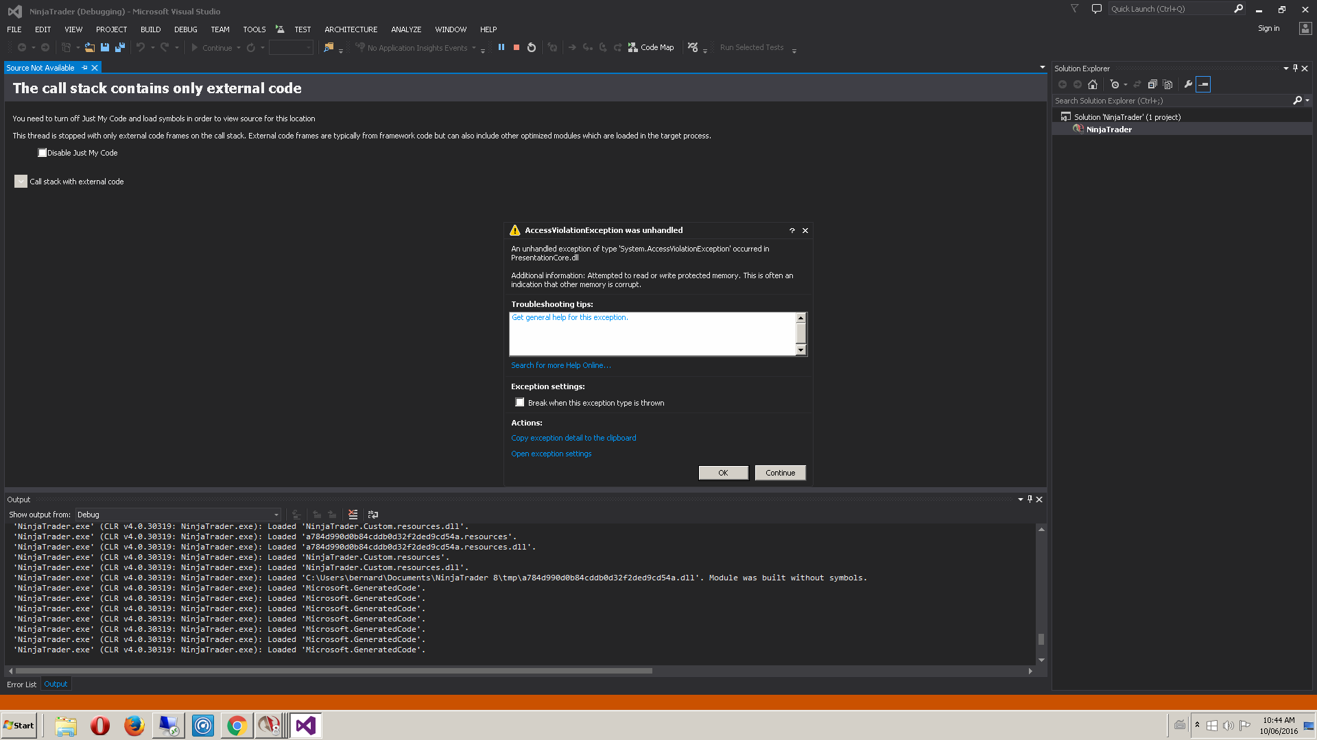 But I had the choice to close the program or debug it with Visual Studio.